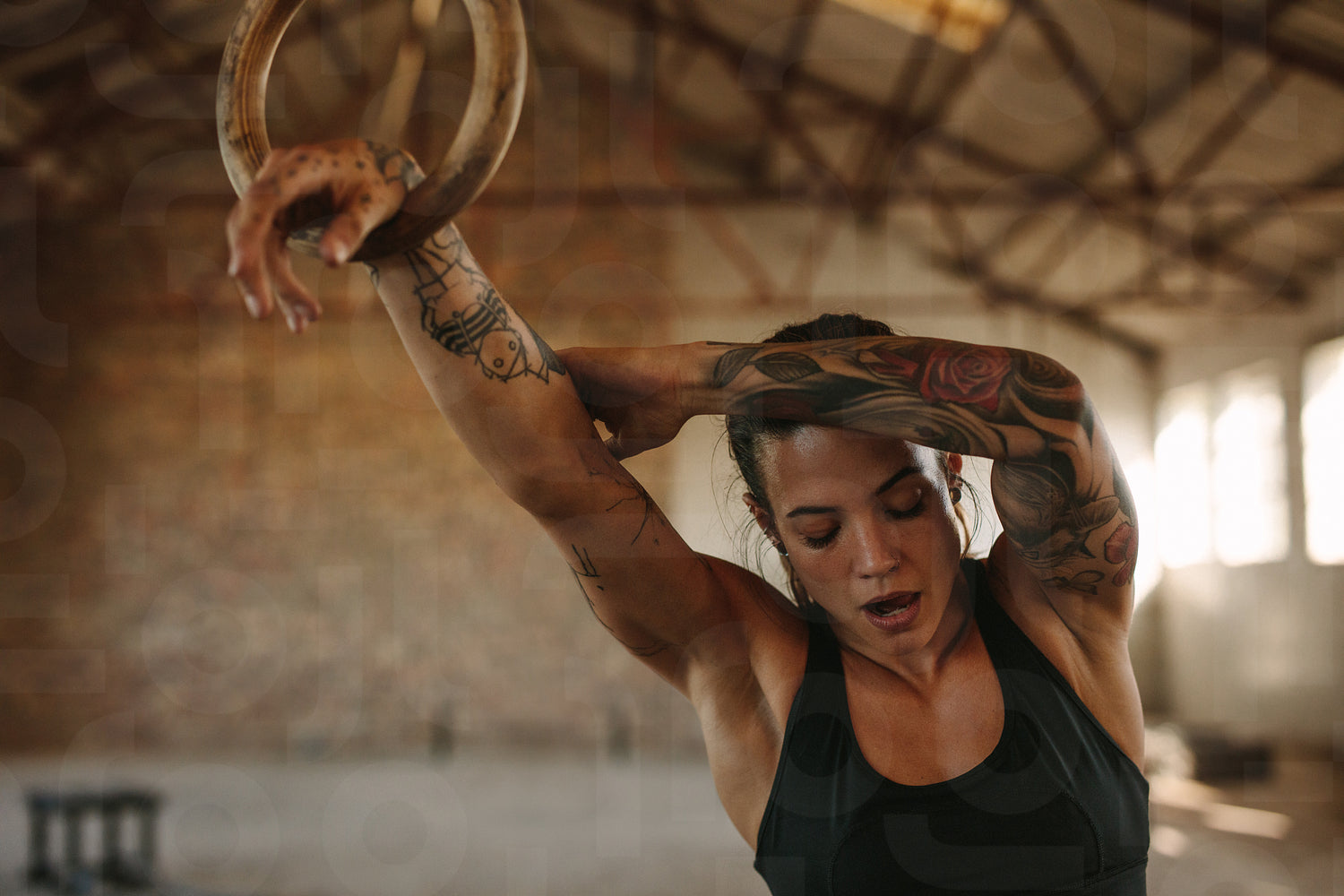 Fit young woman resting after exercising on gymnastic rings. Tattooed female standing in cross training studio holding rings and looking down.