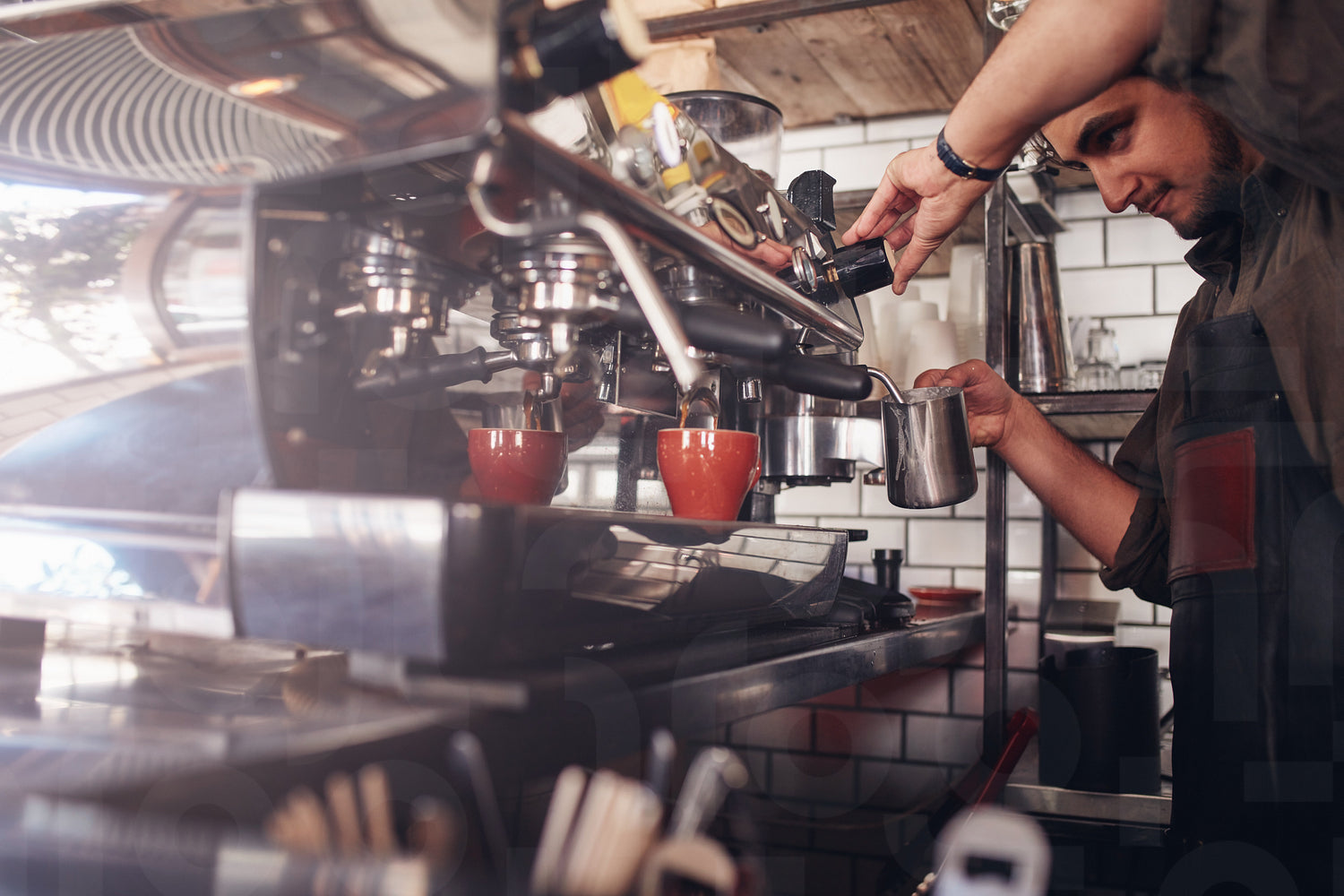 Shot of barista using a coffee maker to make a cup of coffee. Cafe worker preparing a coffee.