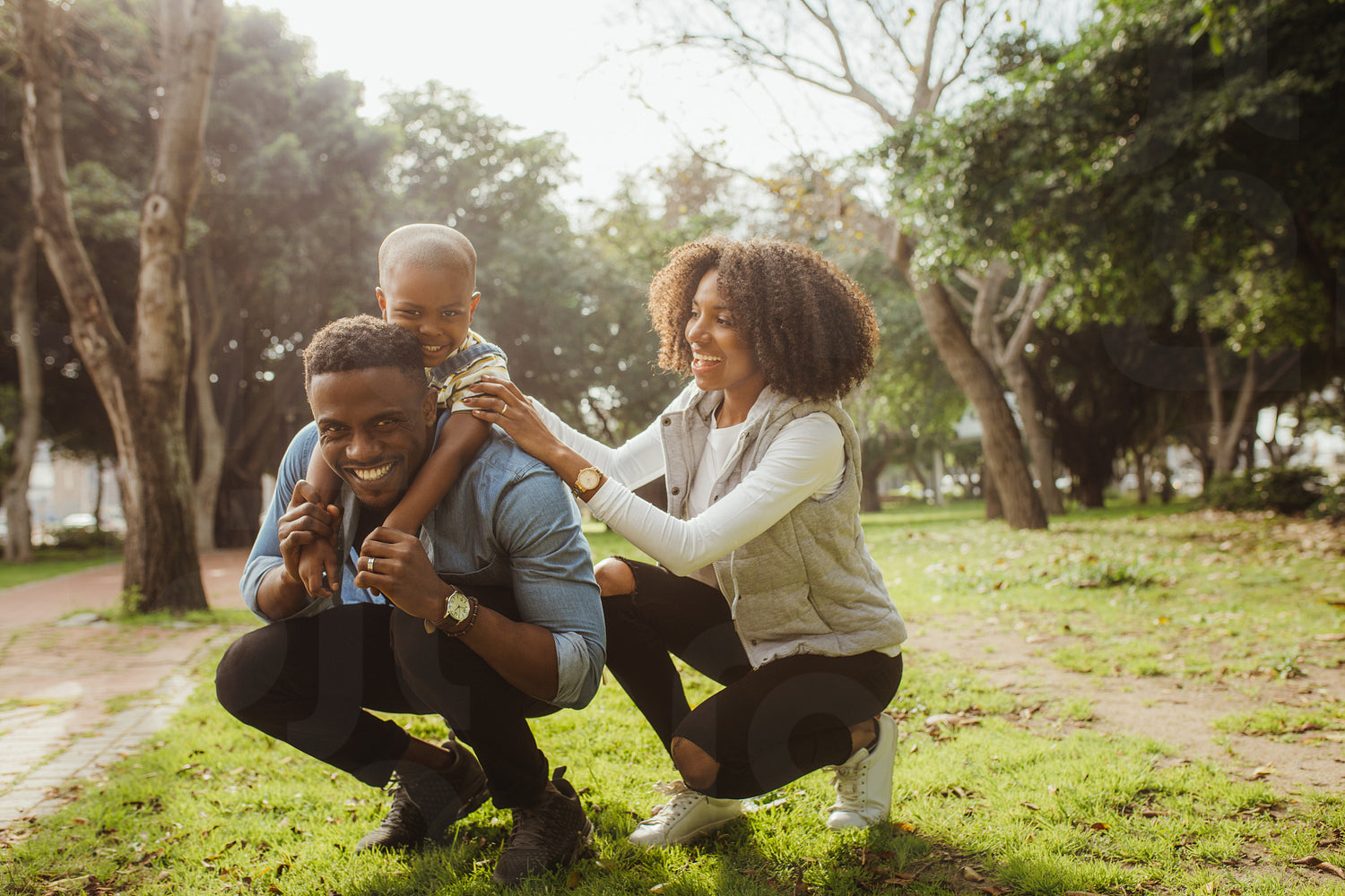 Man carrying his son on his back with woman supporting at park. Happy young african family enjoying at the park.