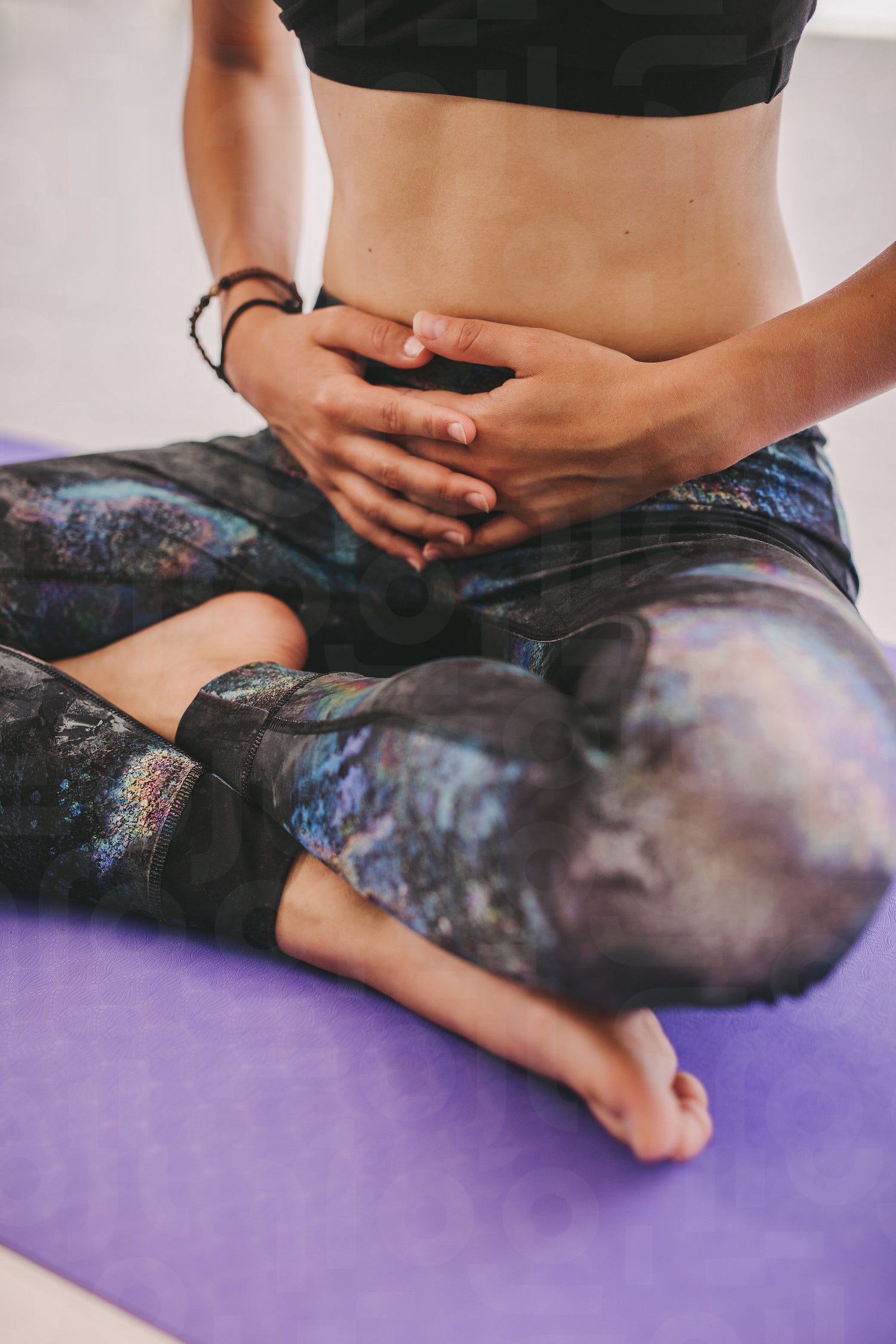 Cropped shot of woman sitting on yoga mat with her legs crossed and hands over her belly. Female doing yoga at fitness class.