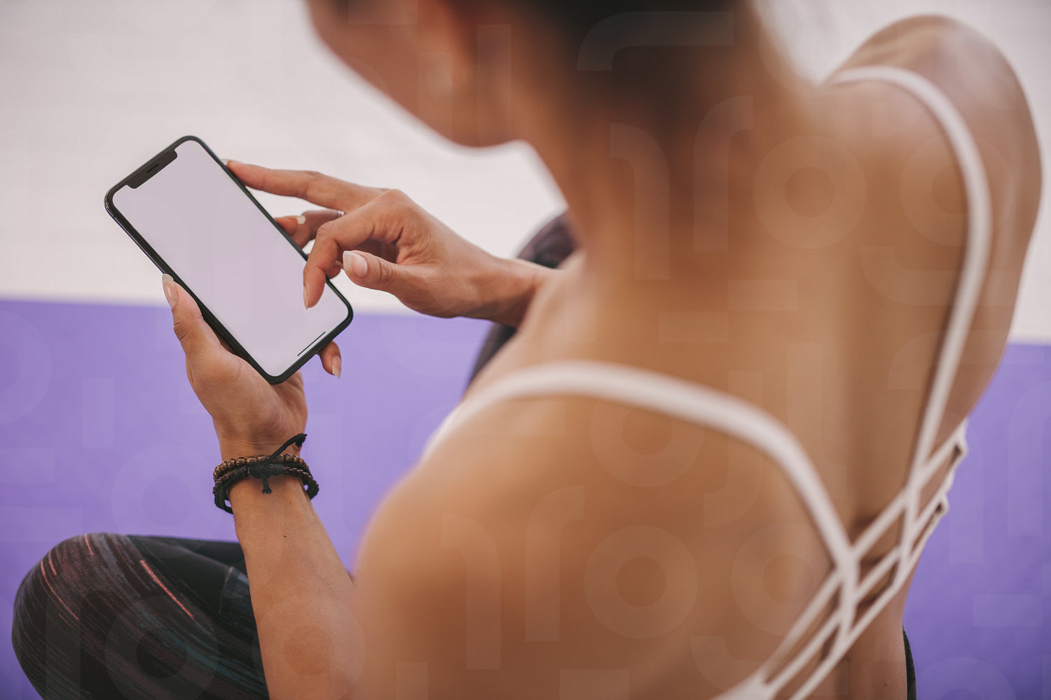 Closeup shot of fitness woman sitting on yoga mat and using mobile phone. Woman using cellphone after yoga workout.