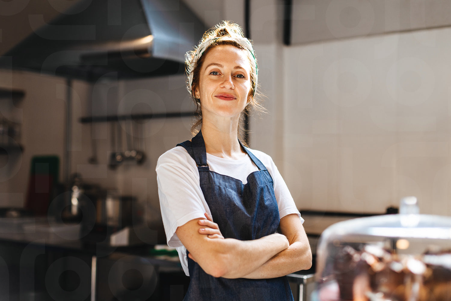 Female cafe owner, showing confidence in her small business, stands in front of the camera with arms crossed. Woman wearing an apron, proudly displays her role as a hospitality entrepreneur.