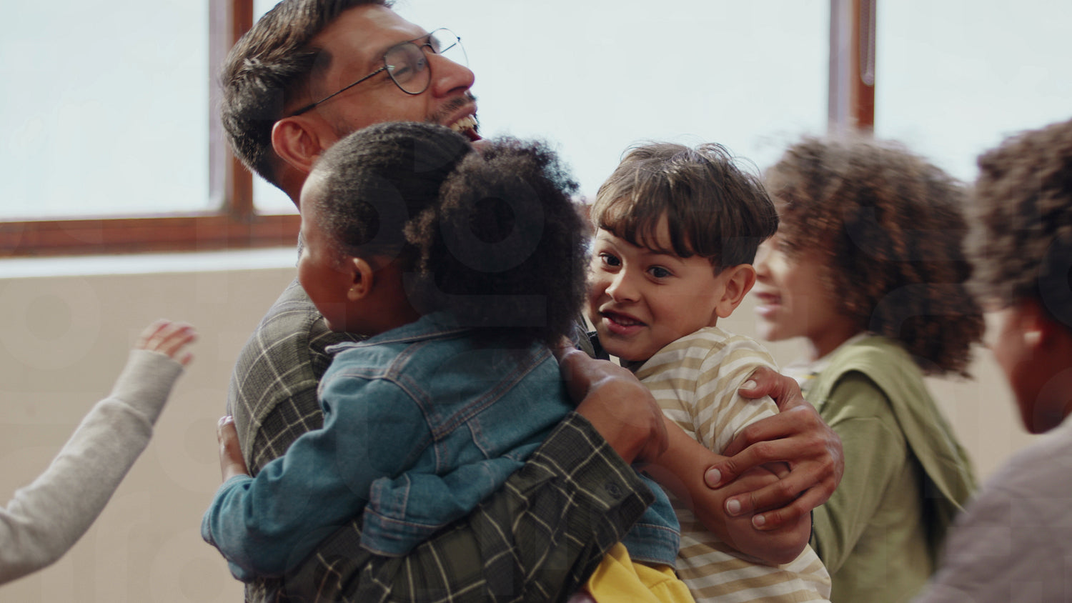 Excited elementary school children running to embrace their class teacher on the first day of the new school year. Diverse young kids greeting their male tutor with a warm welcome on first day of class.
