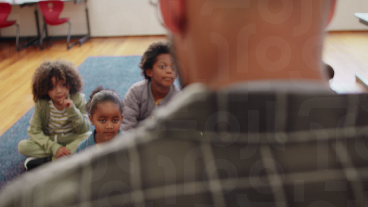 Technology for early child development. Male teacher teaching a first grade elementary school class using a tablet. Actively engaging with the young children in a lesson, he creates a fun learning environment.