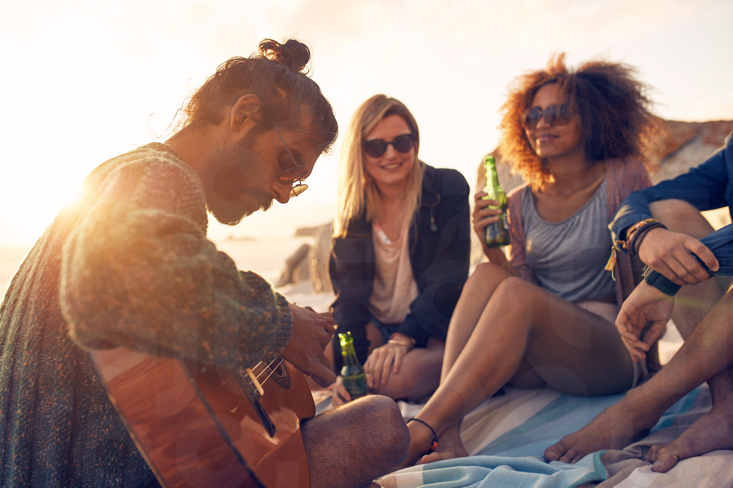 Hipster playing guitar for friends at the beach. Group of young people drinking beer and listening to music.