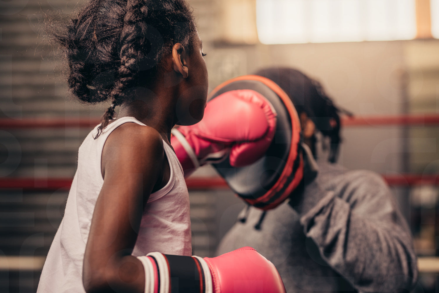 Girl wearing boxing gloves straining with her coach. Boxing kid practicing punches on a punching pad with her coach.
