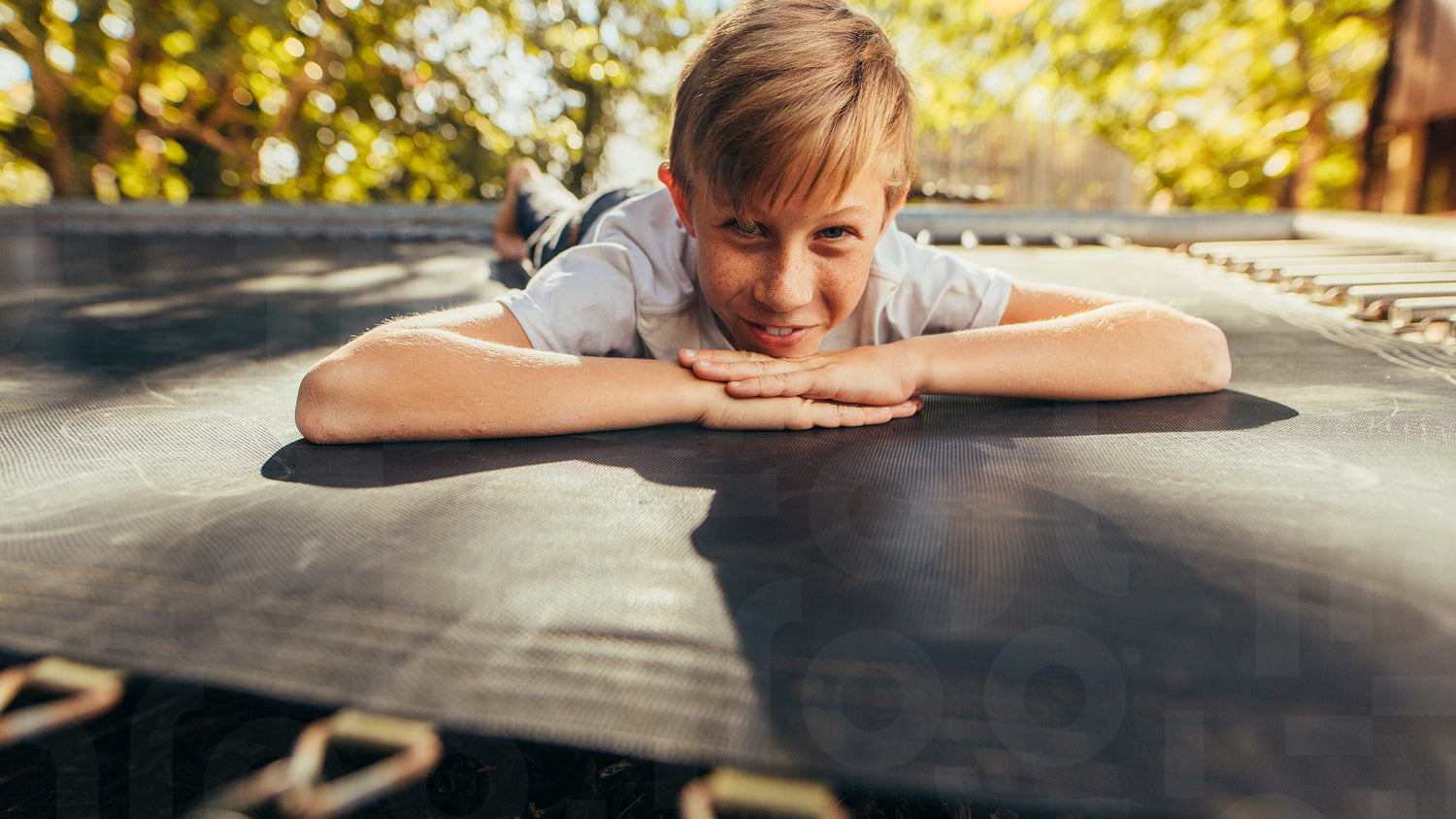 Small boy lying on trampoline outdoors. Little kid relaxing on a trampoline looking at camera and smiling.