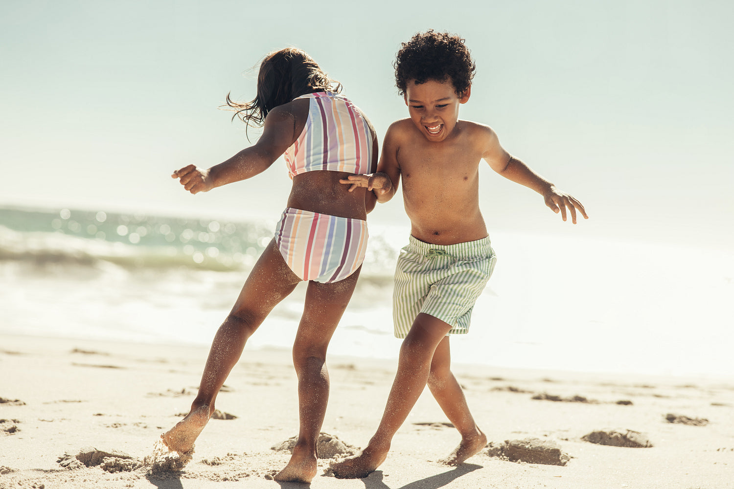 Two active little kids playing around on beach sand during summer vacation. Two adorable children having fun together in swimwear.