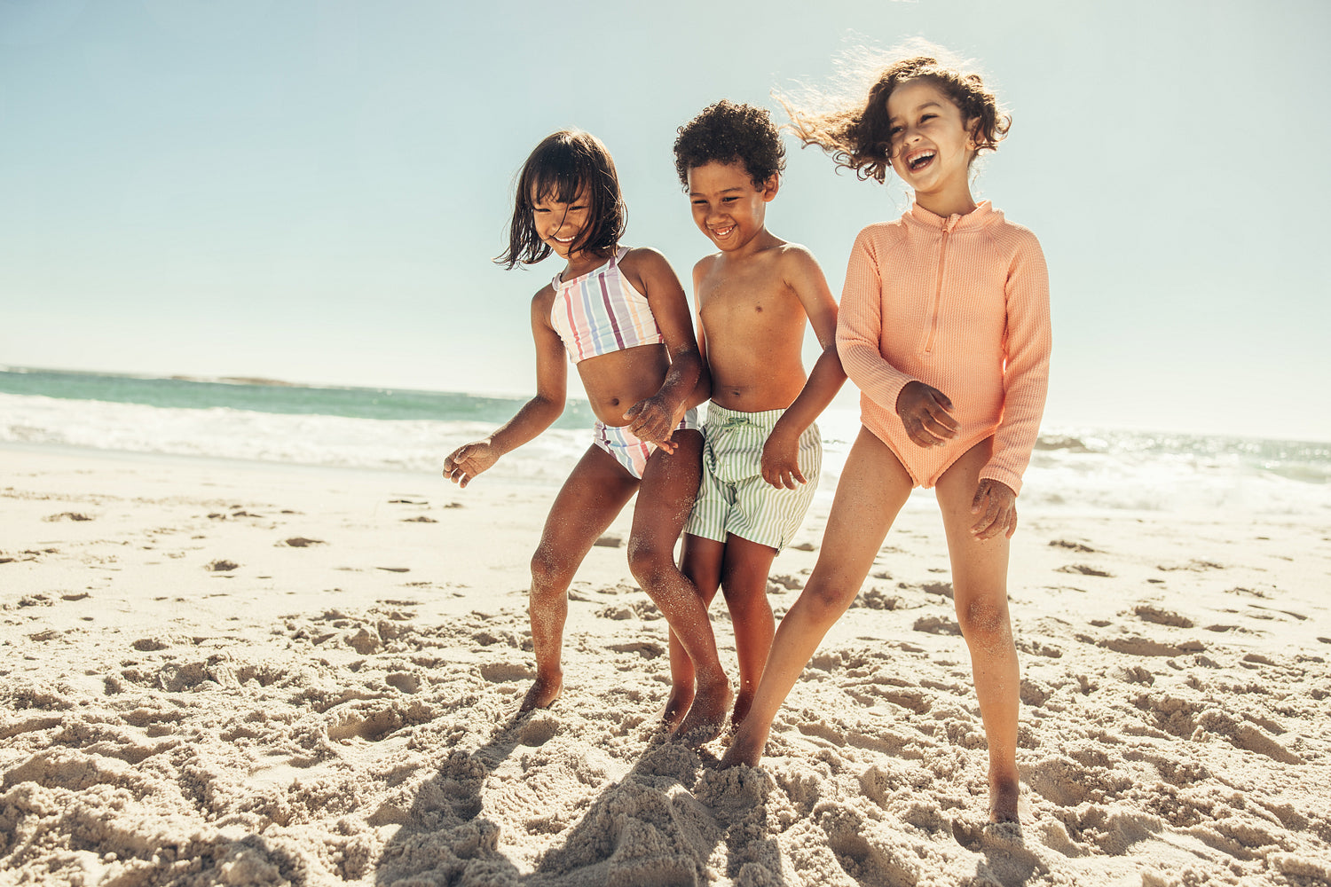 Cheerful little children laughing and playing together at the beach. Group of three adorable little children having fun together during summer vacation.