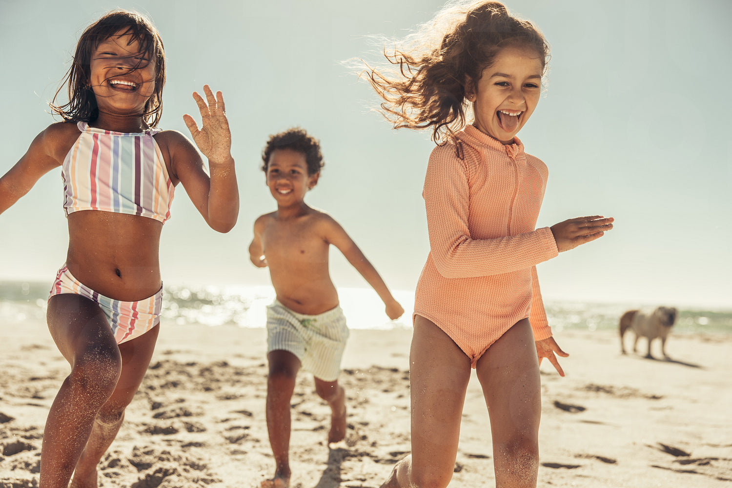 Enjoying a fun race at the beach. Happy young friends laughing cheerfully while playing around on beach sand. Group of adorable little children having fun and enjoying their summer vacation.