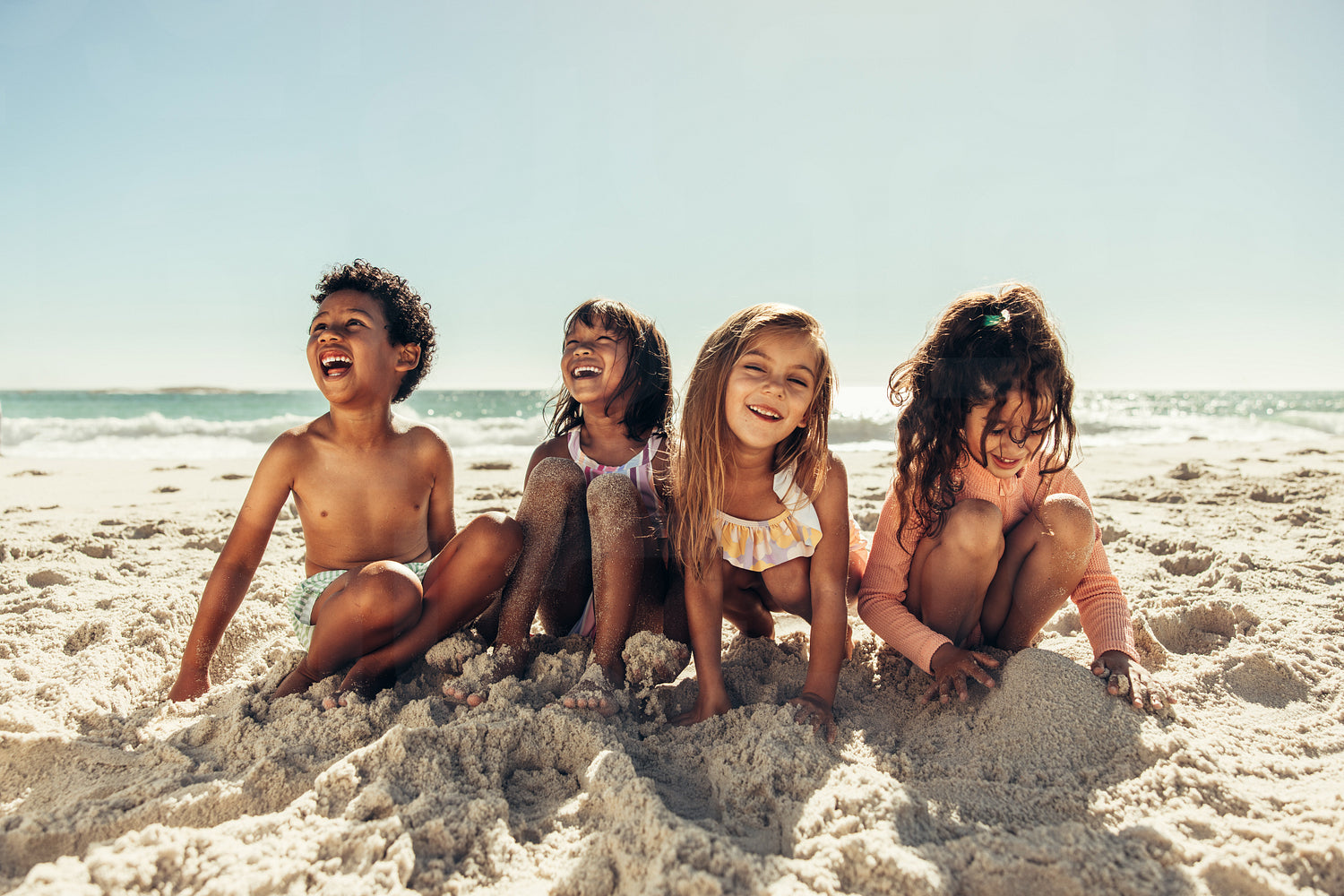 Four young friends laughing cheerfully while playing with sea sand at the beach. Group of adorable little kids having a good time together during summer vacation.