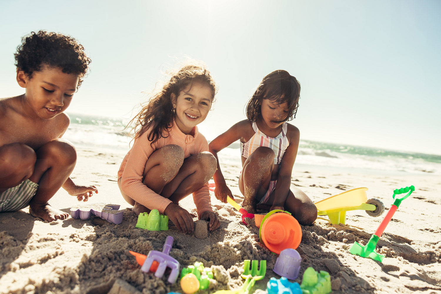 Group of happy kids playing with their toys on beach sand. Three carefree children having a good time at a sunny beach during summer vacation.