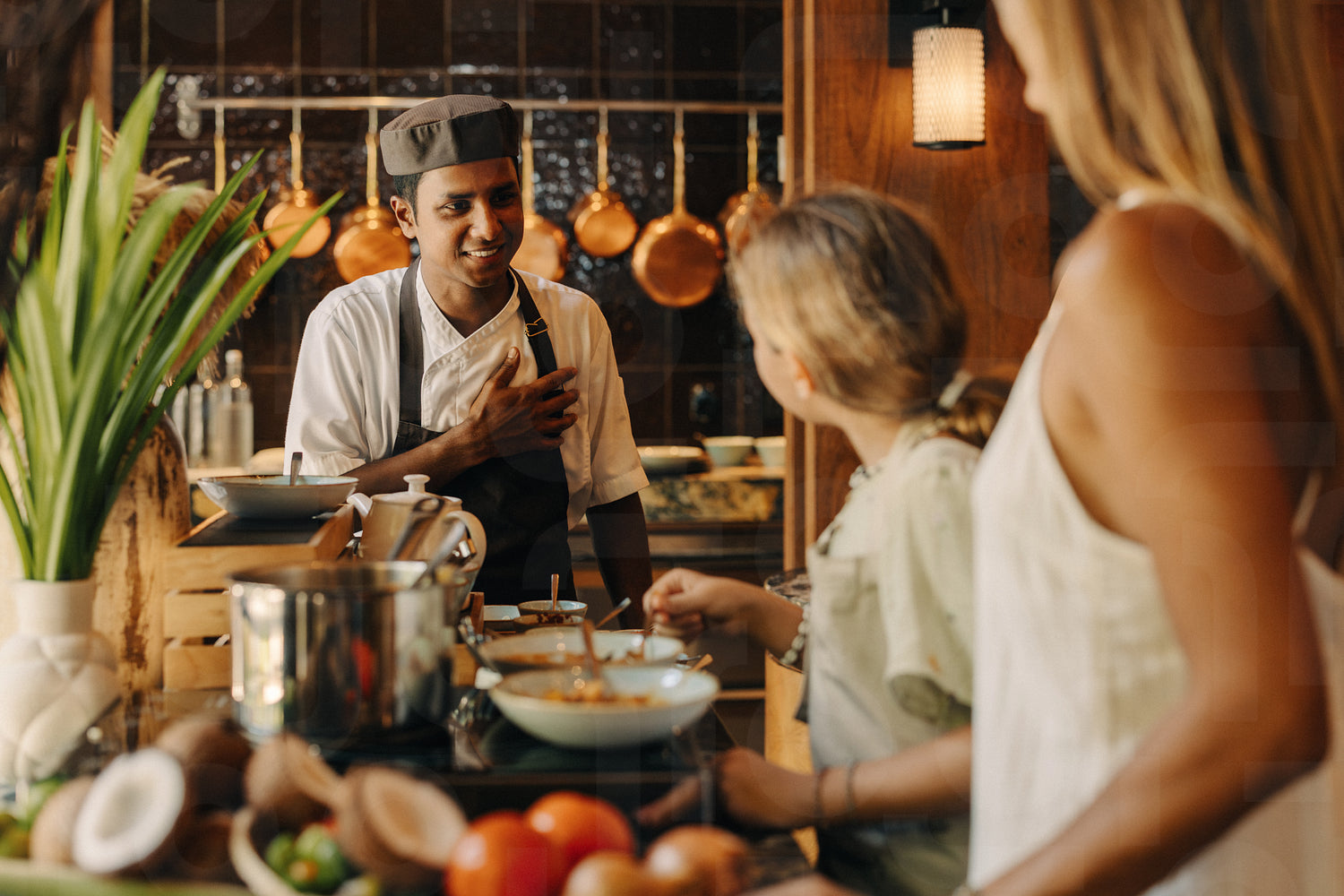 Chef interacting with customers in a warm and welcoming kitchen environment