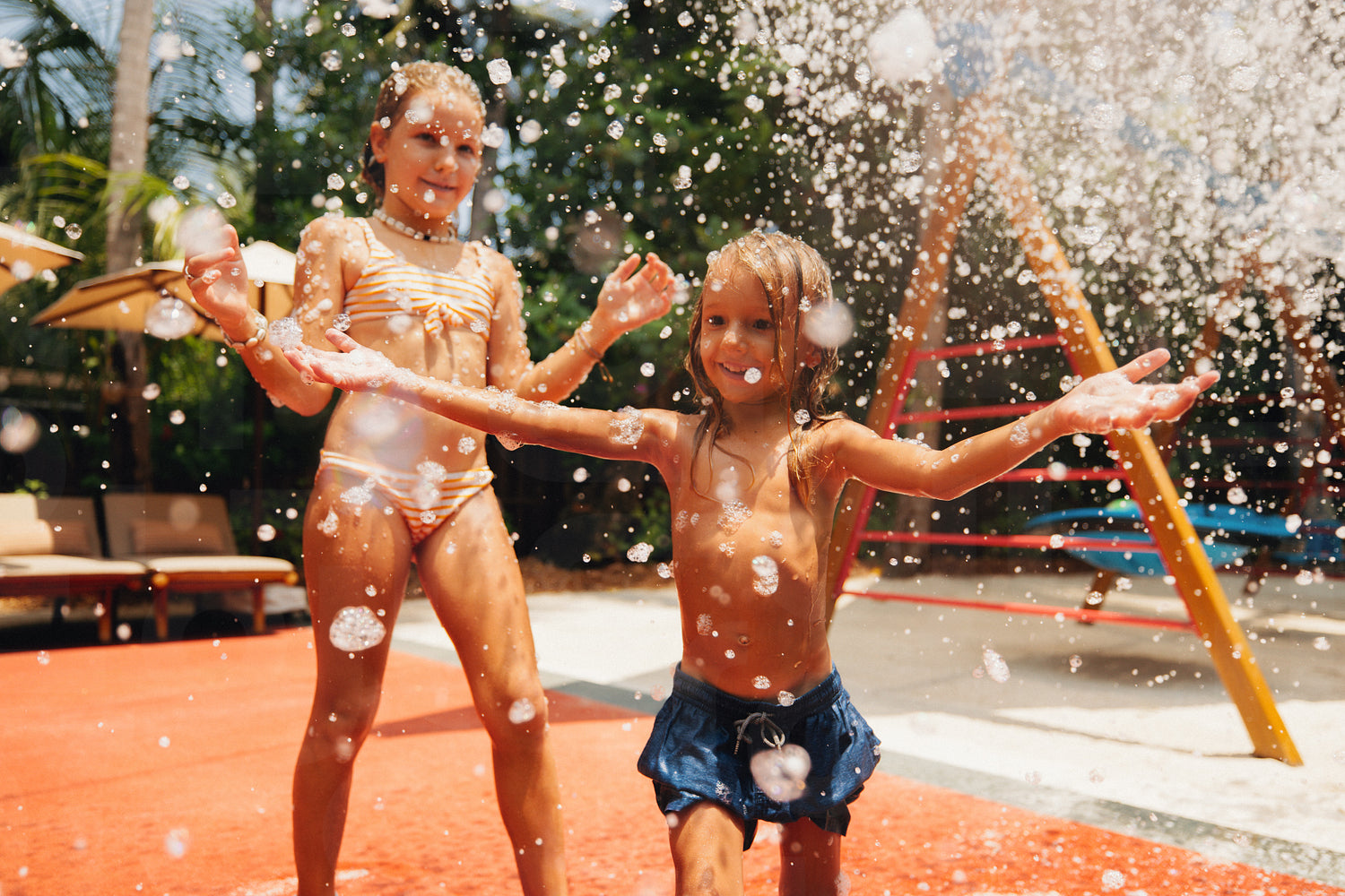 Two children enjoying a foam party at a resort's kids club, playing and having fun in the water spray.