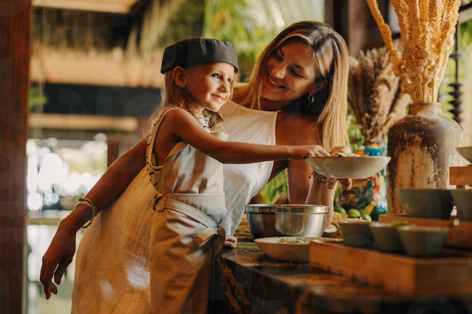 A happy mother and her young son share a joyful moment cooking together in an island resort kitchen filled with natural light and a warm atmosphere.