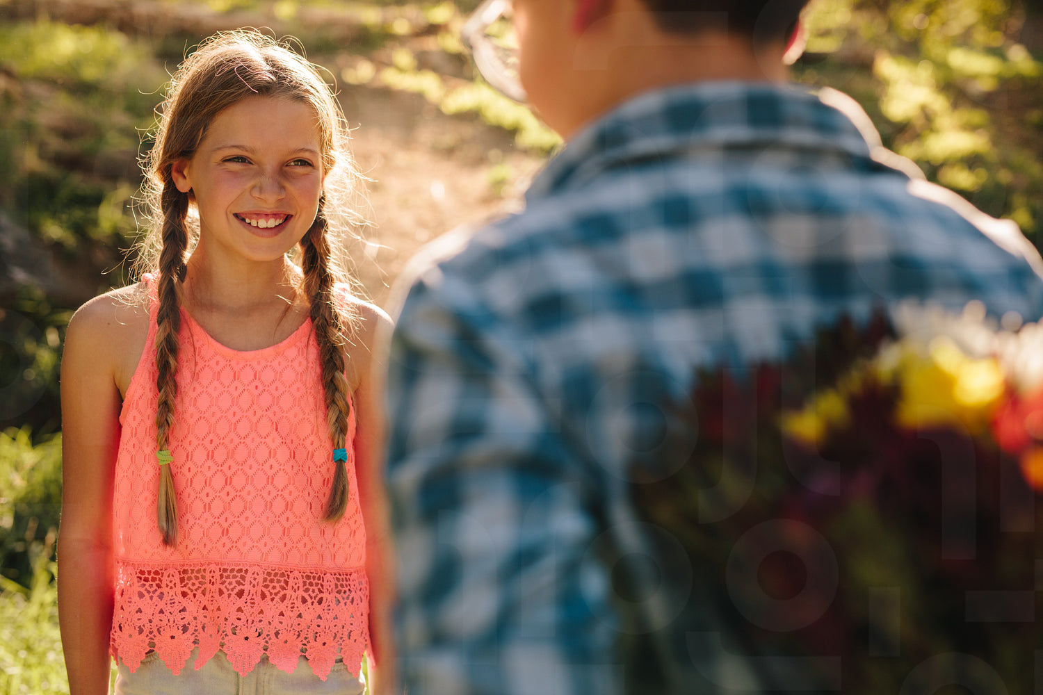 Excited girl standing in park with her boyfriend. Boy hiding a bunch of flowers behind him standing in front of a girl.