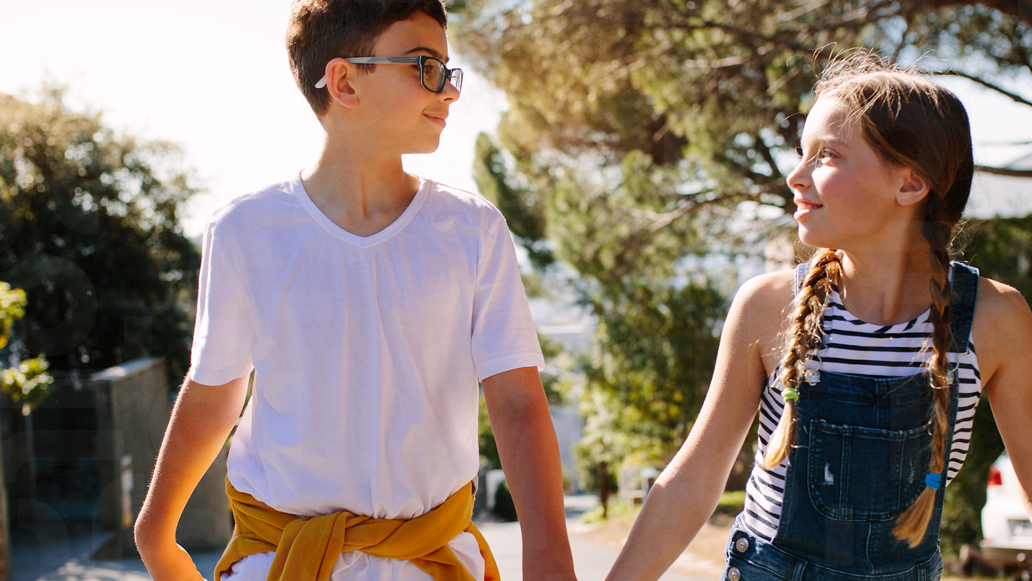 Kids in love walking on a street holding hands looking at each other. Smiling boy and girl walking on street together .