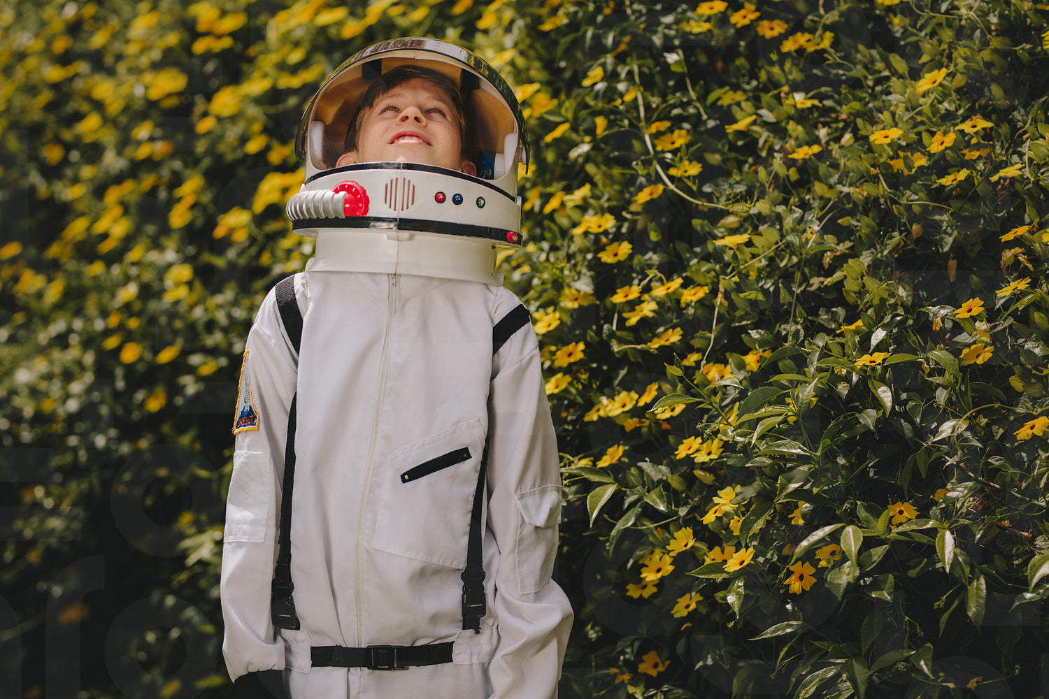 Boy wearing space suit and helmet standing outdoors and looking up. Cute boy in astronaut dress playing outdoors.