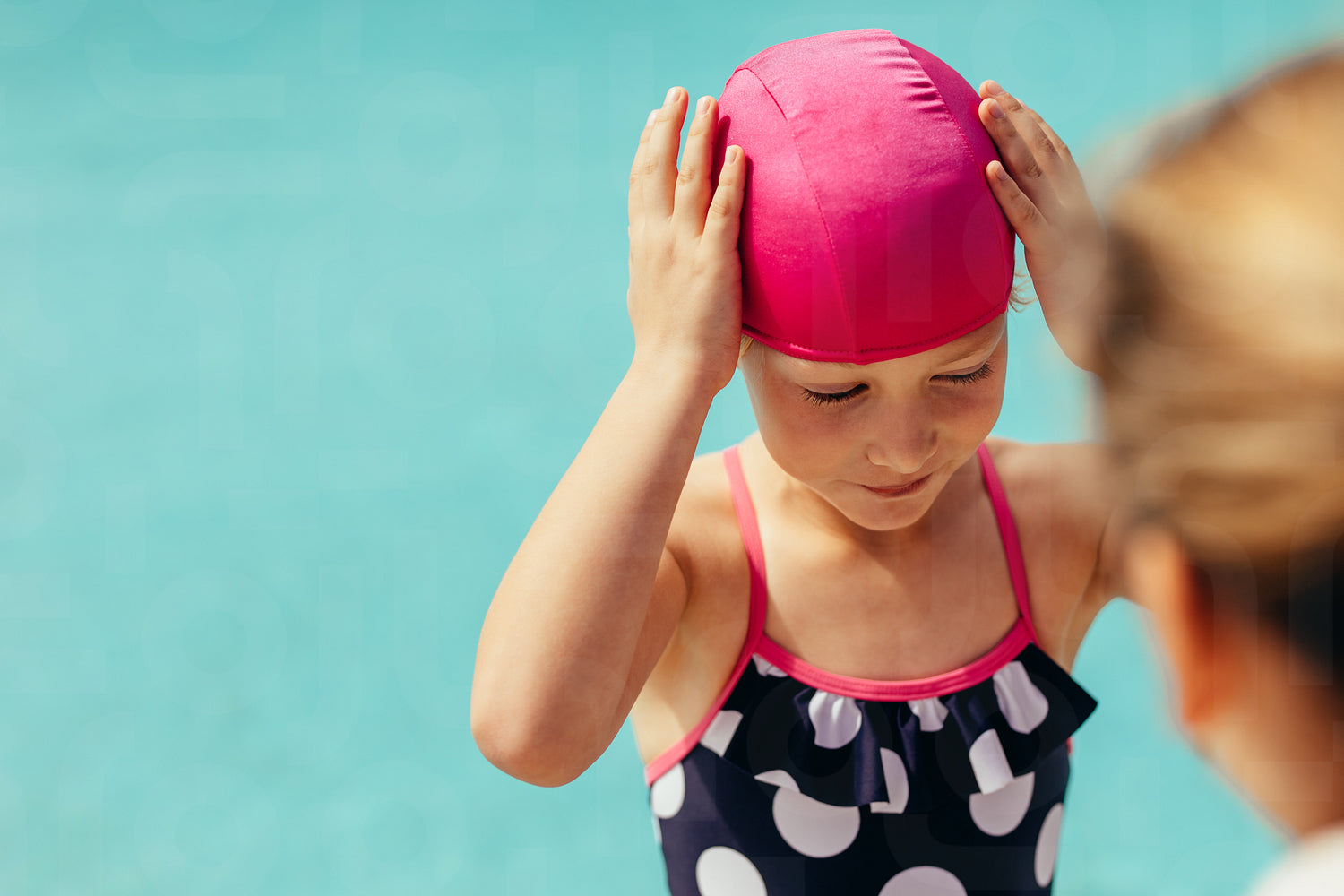 Girl child wearing swimming cap with coach in front. Girl getting ready for swimming lessons.