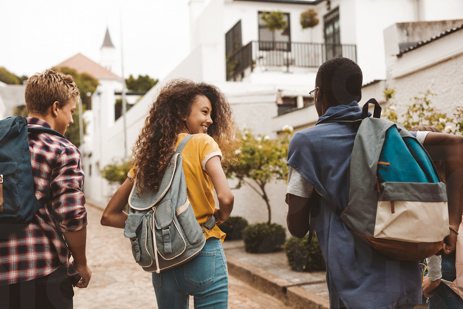 Rear view of teenage friends walking together in the street. Smiling teenage girl walking with friends wearing college bag.