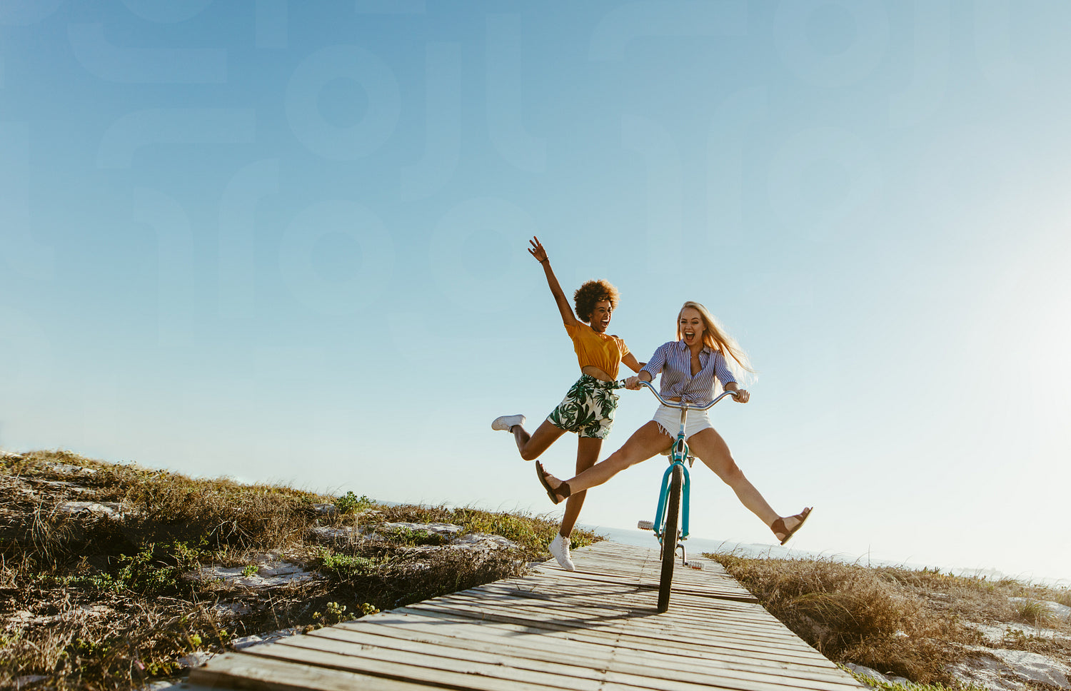 Excited woman riding bike down the boardwalk with her friends running behind. Two young female friends having a great time on their vacation.