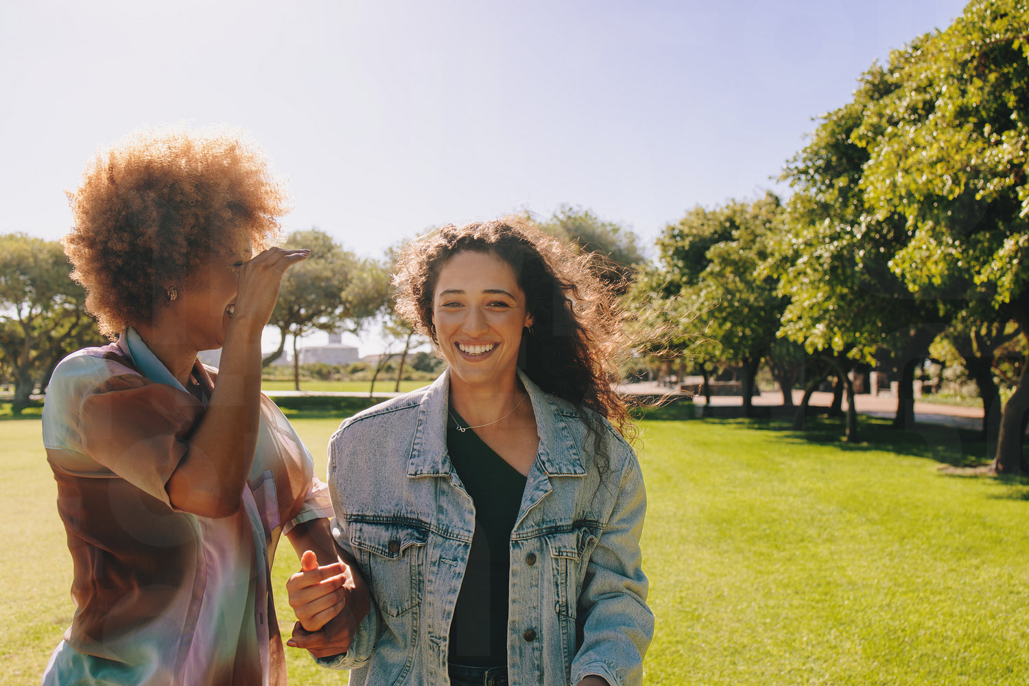 Two girlfriends laughing and enjoying their time in a park, showcasing friendship and outdoor fun on a sunny day.