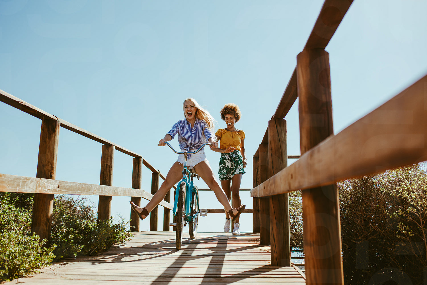 Excited woman riding bike down the boardwalk with her friends running behind. Two young female friends having a great time on their vacation.