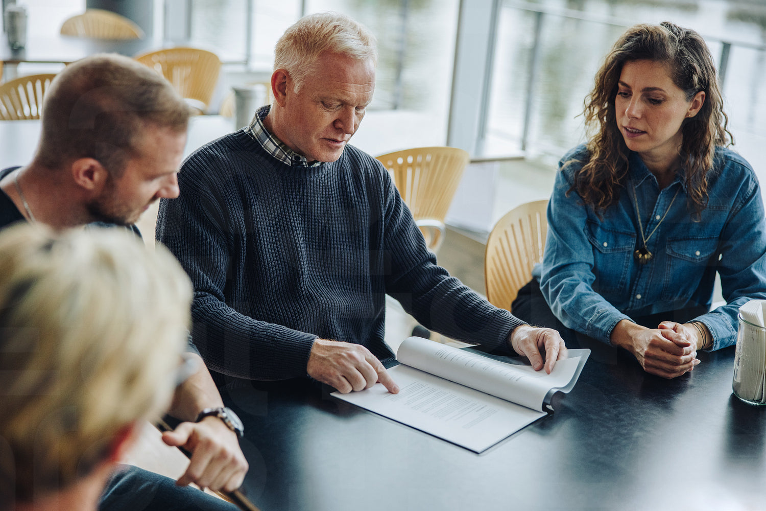 Senior professional reading a contract document with colleagues sitting by in boardroom. Business team discussing over a contract in office.