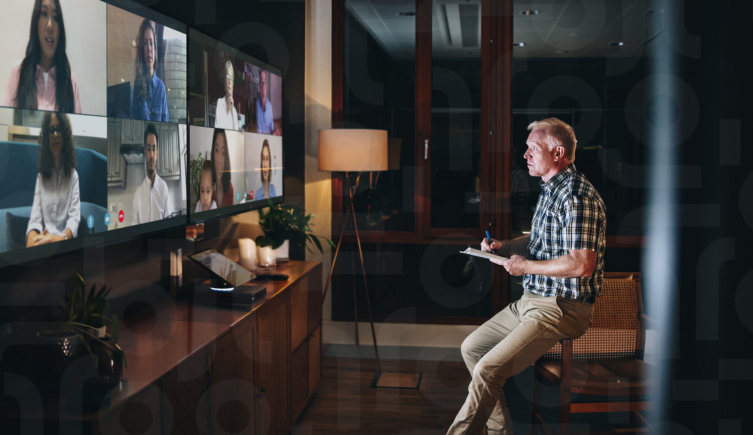 Business team meeting online over a video call. Man sitting office boardroom and having a video conference with his colleagues at night.