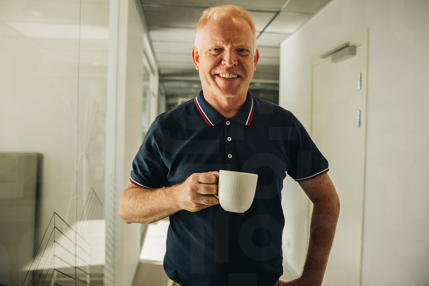 Portrait of a happy senior manager having coffee at work. Businessman having coffee break at work.