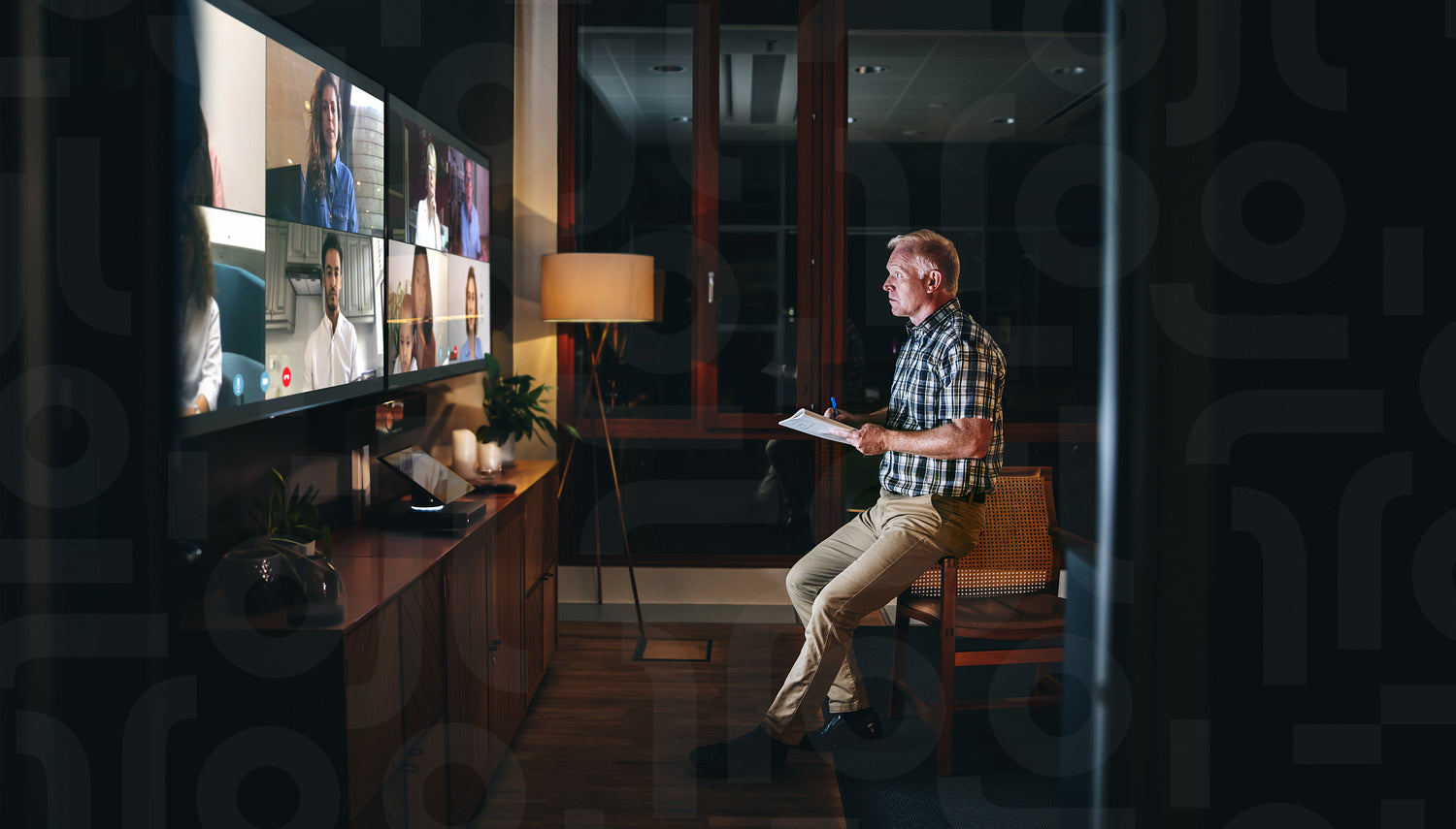 Businessman doing a video call at night with colleagues. Entrepreneur on video conference with team.