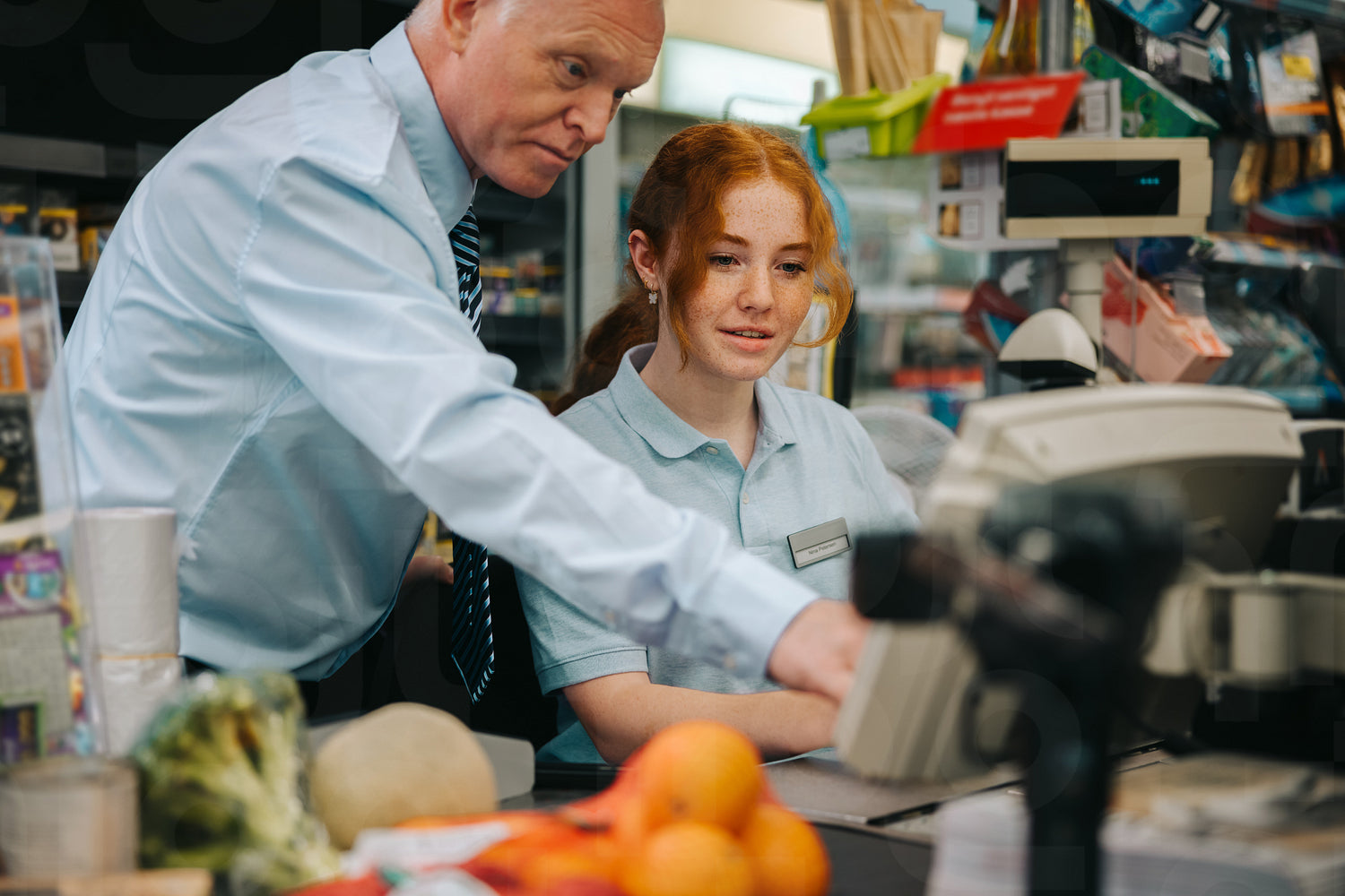 Senior manager showing the checkout process to new female employee in grocery store. New cashier getting help from store manager at checkout counter.