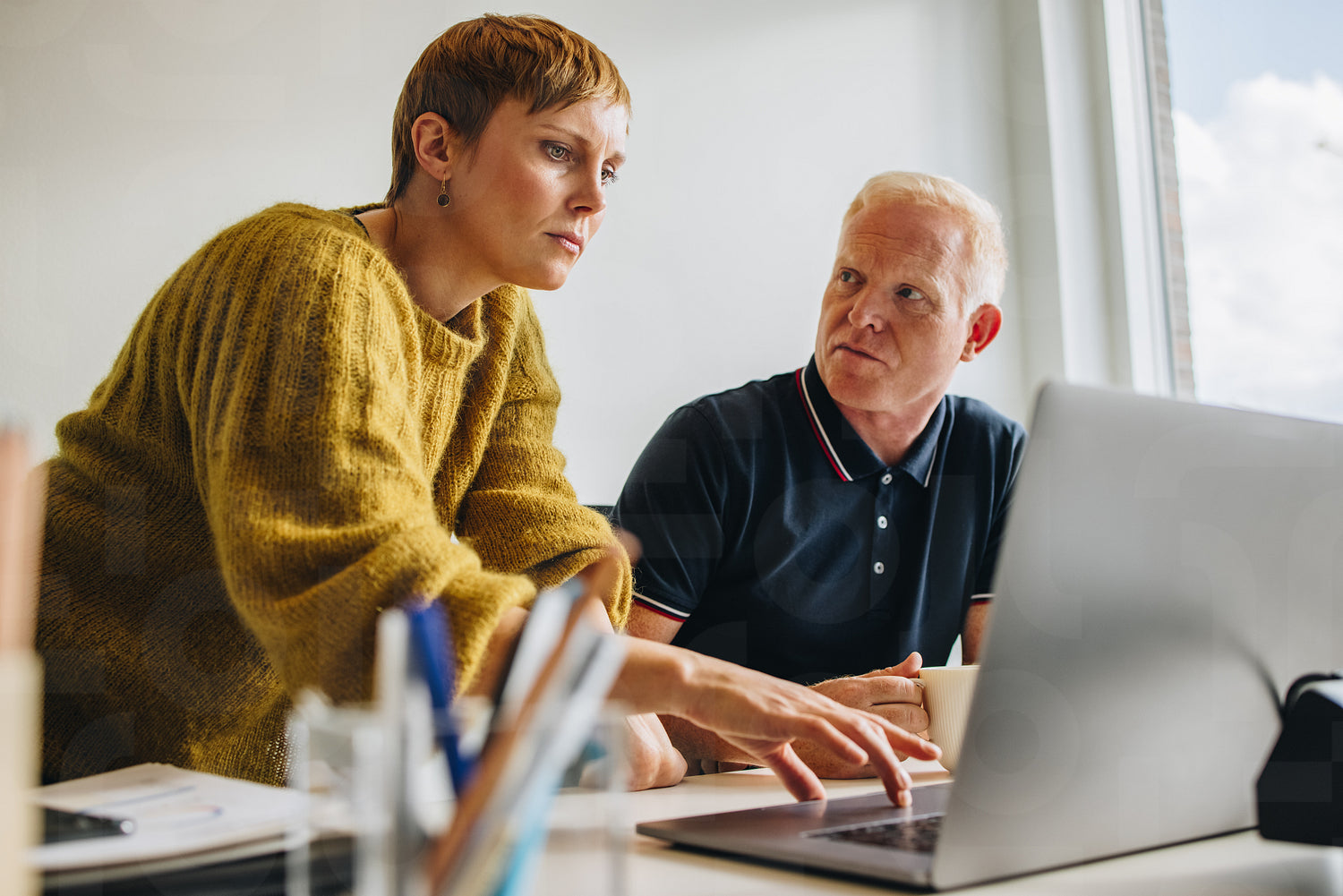 Businesswoman using laptop with colleague sitting by at desk. Two office colleagues using laptop.