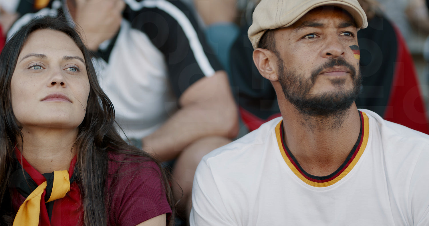 People sitting in fan zone looking at a camera above cheering, waving and blowing a kiss in stadium. Germany soccer team supporters having great fun while watching a live match from stands.