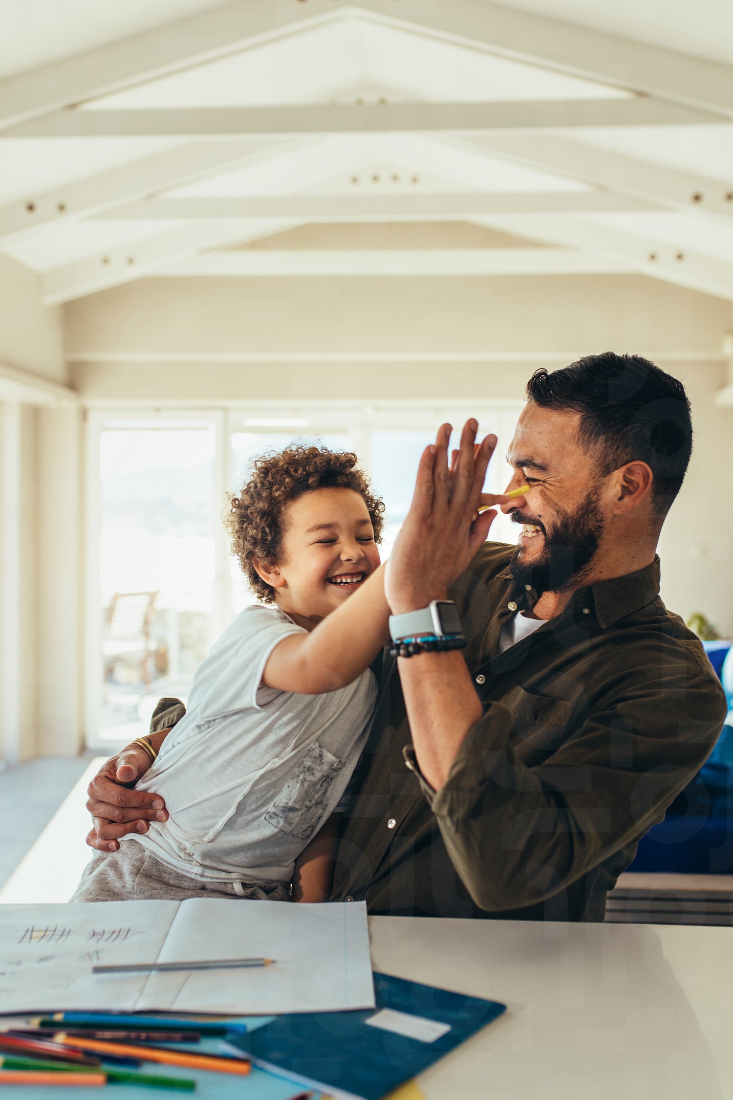 Happy kid sitting on the lap of his father at the table and giving high five. Man and son having fun sitting at the study table.
