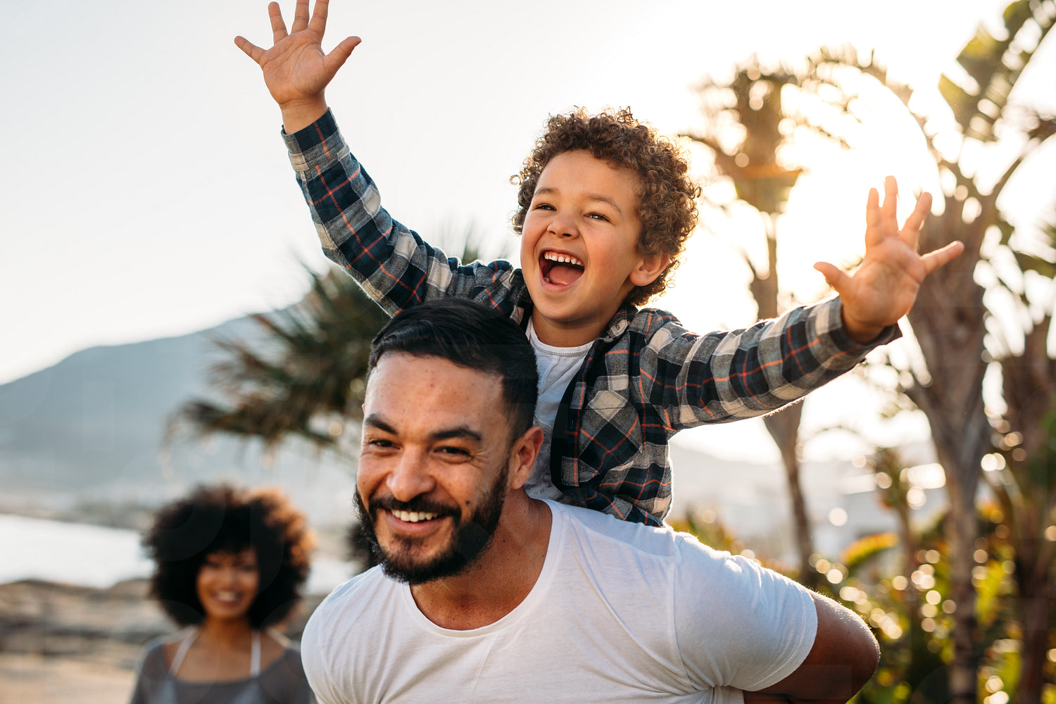 Happy kid piggy riding on his father with open arms. Man walking outdoors carrying his son on his back.