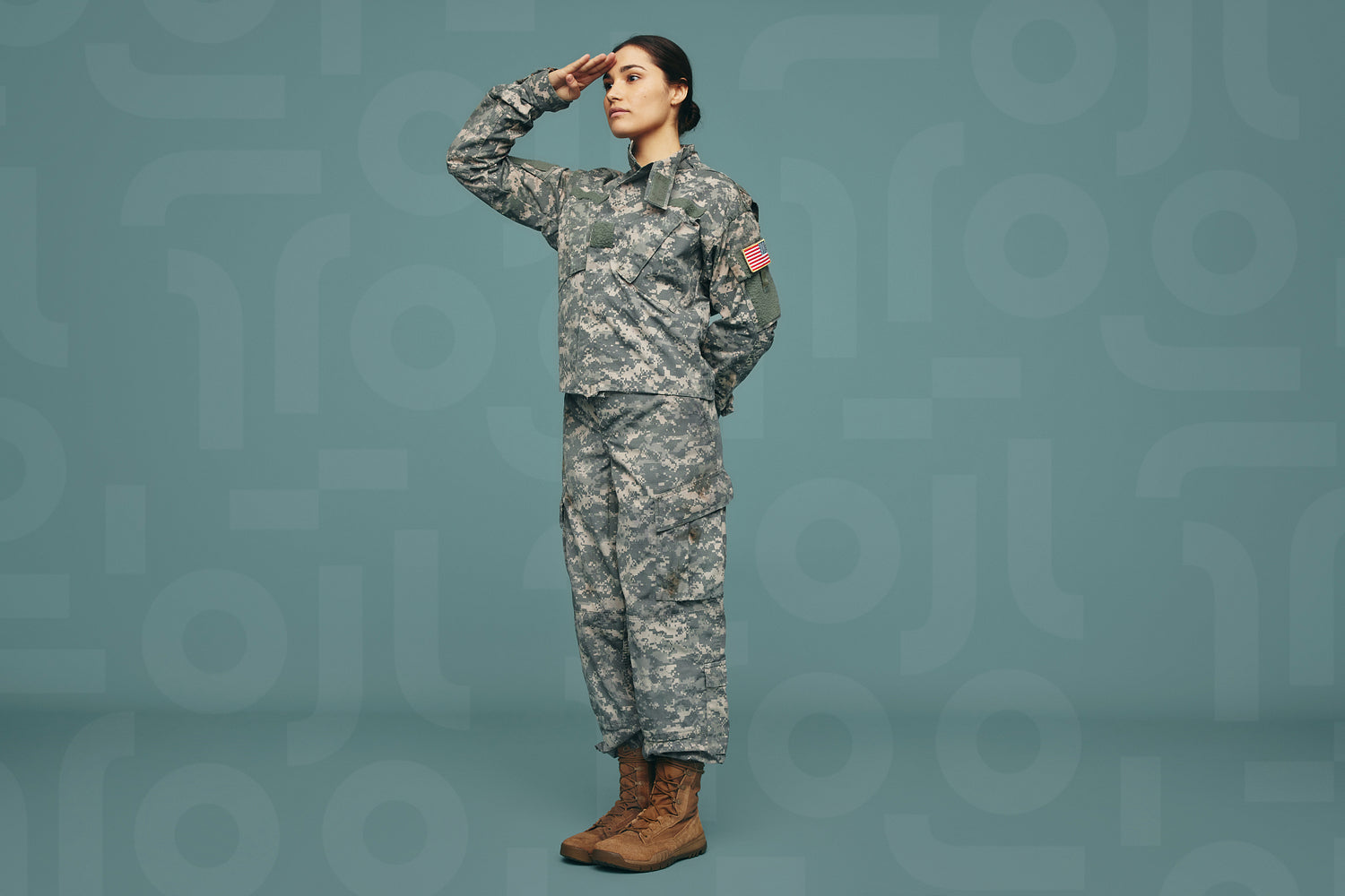 American army soldier saluting while standing against a studio background. Courageous young servicewoman wearing the camouflage military uniform of the United States Armed Forces.