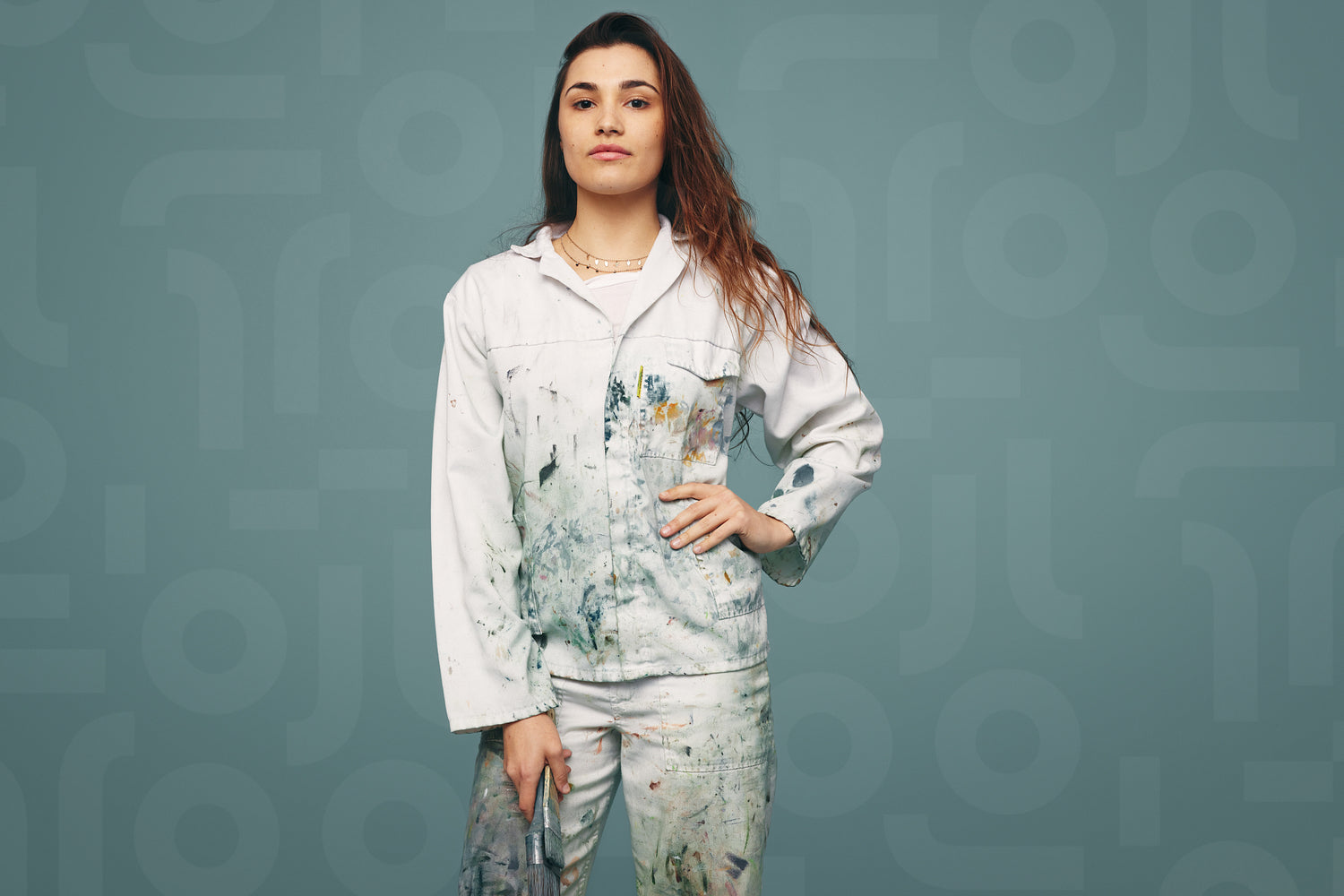 Young female painter looking at the camera while standing with paintbrushes in her hand. Confident young artist wearing her colour painted uniform against a studio background.