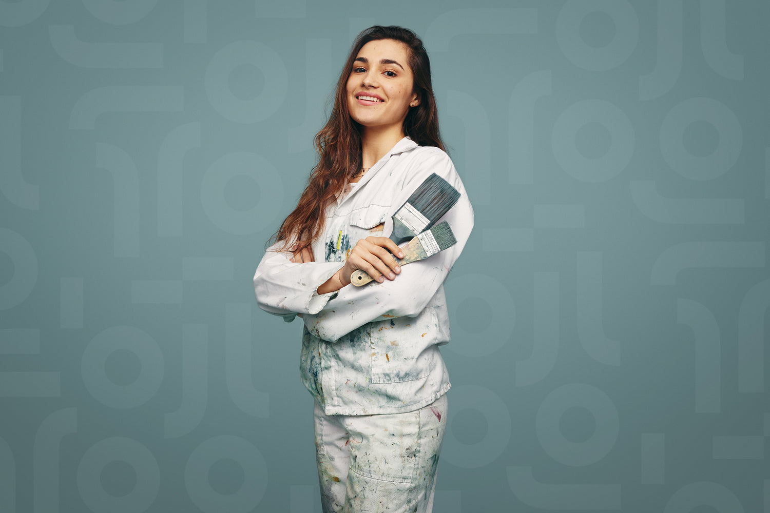 Female painter smiling at the camera while holding her paintbrushes in a studio. Happy young artist wearing her colour painted uniform against a studio background.