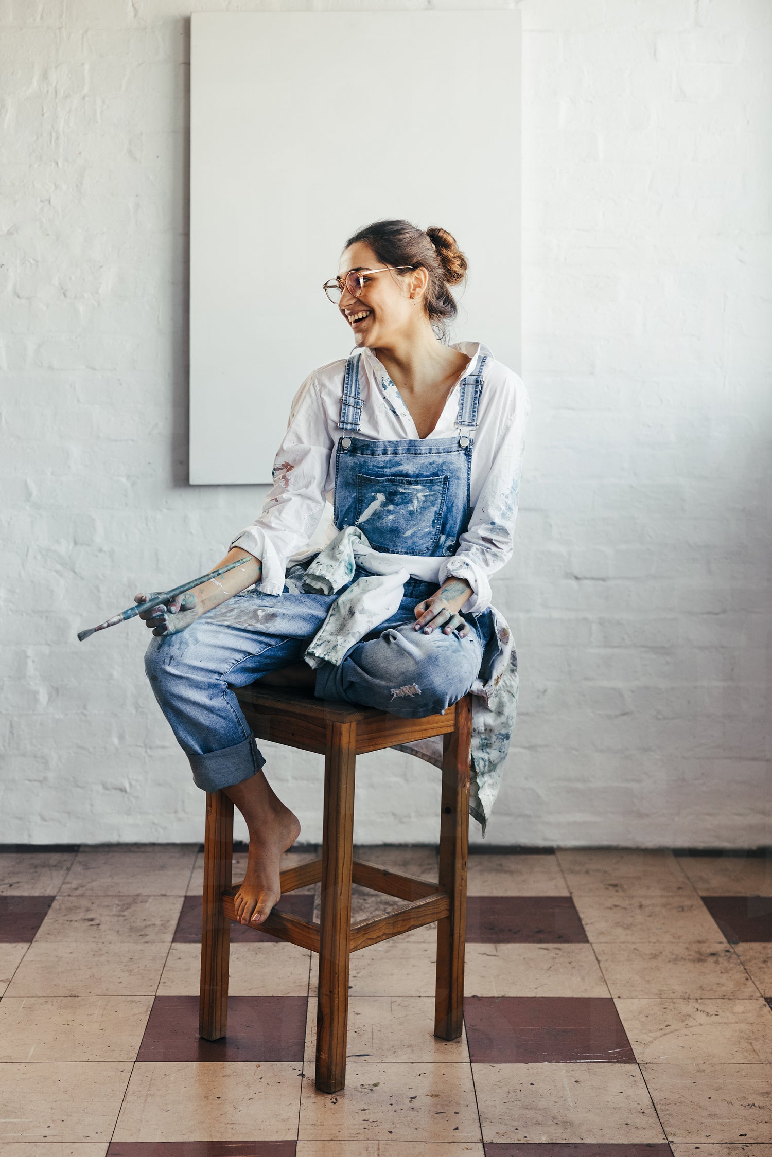 Happy young painter smiling cheerfully in her art studio. Female artist holding a paintbrush while sitting in front of a blank canvas. Creative young woman feeling excited to start a new project.