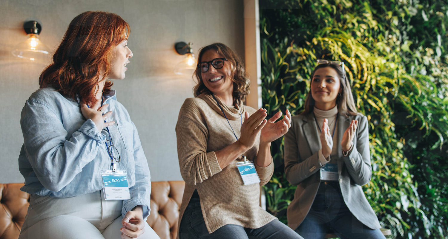Business women and colleagues in an office, participating in a panel discussion. They are applauding and smiling, showcasing teamwork and a happy workplace. The event emphasizes networking and collaboration, showcasing the energetic and productive meeting.