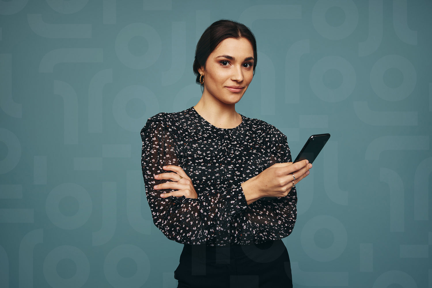 Young woman using a mobile phone in a studio. Self-assured young woman looking at the camera while holding a smartphone. Confident young woman reading a text message against a studio background.