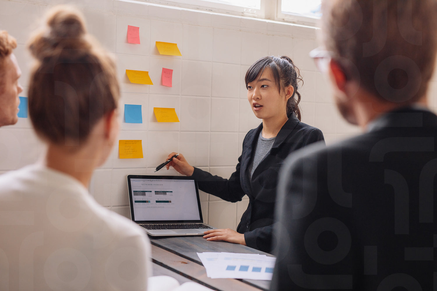 Asian businesswoman explaining her new business ideas to colleagues with laptop and adhesive notes on wall. Young female executive giving presentation to coworkers.