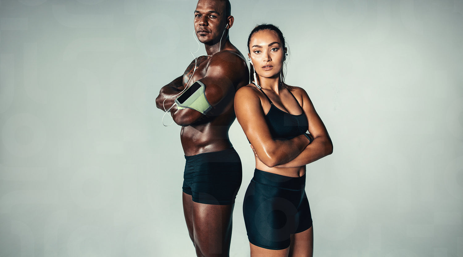 Portrait of beautiful athletic couple standing together on grey background. Muscular young man and woman with arms crossed looking at camera.