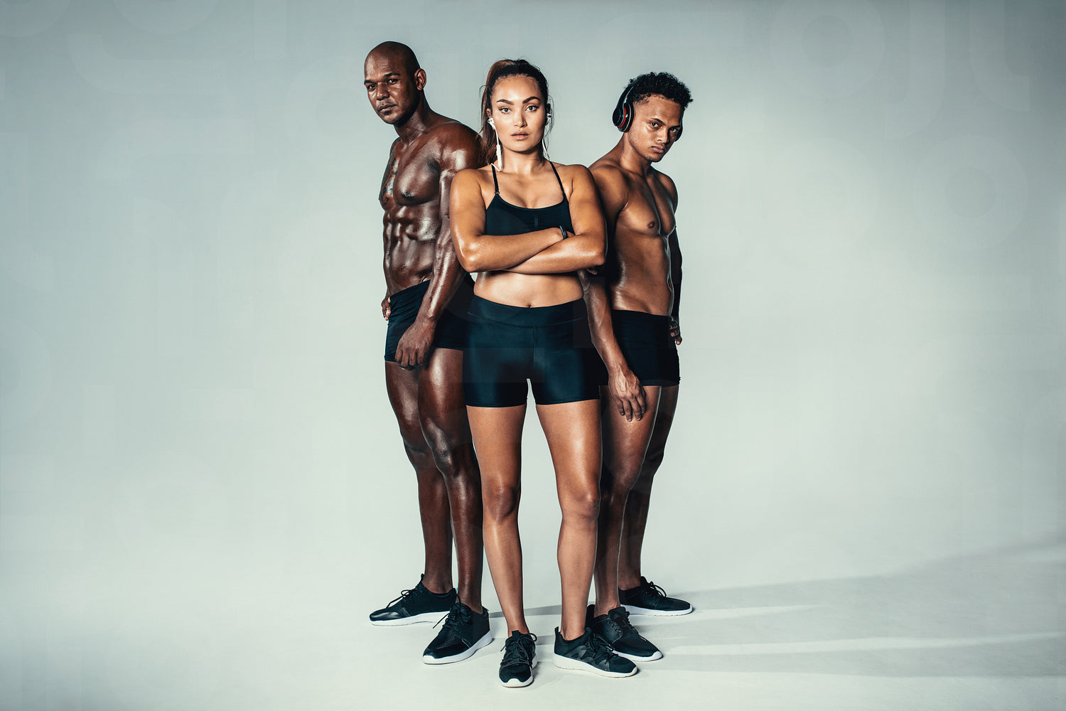 Full length portrait of young men and woman with muscular body standing together over grey background. Group of muscular people looking at camera.