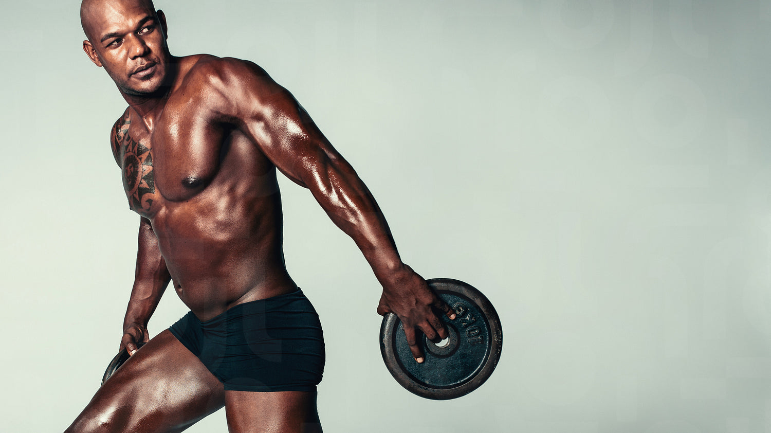 Strong young man exercising with weights against grey background. Shot of african man with muscular build working out holding barbell plate and looking at copy space.