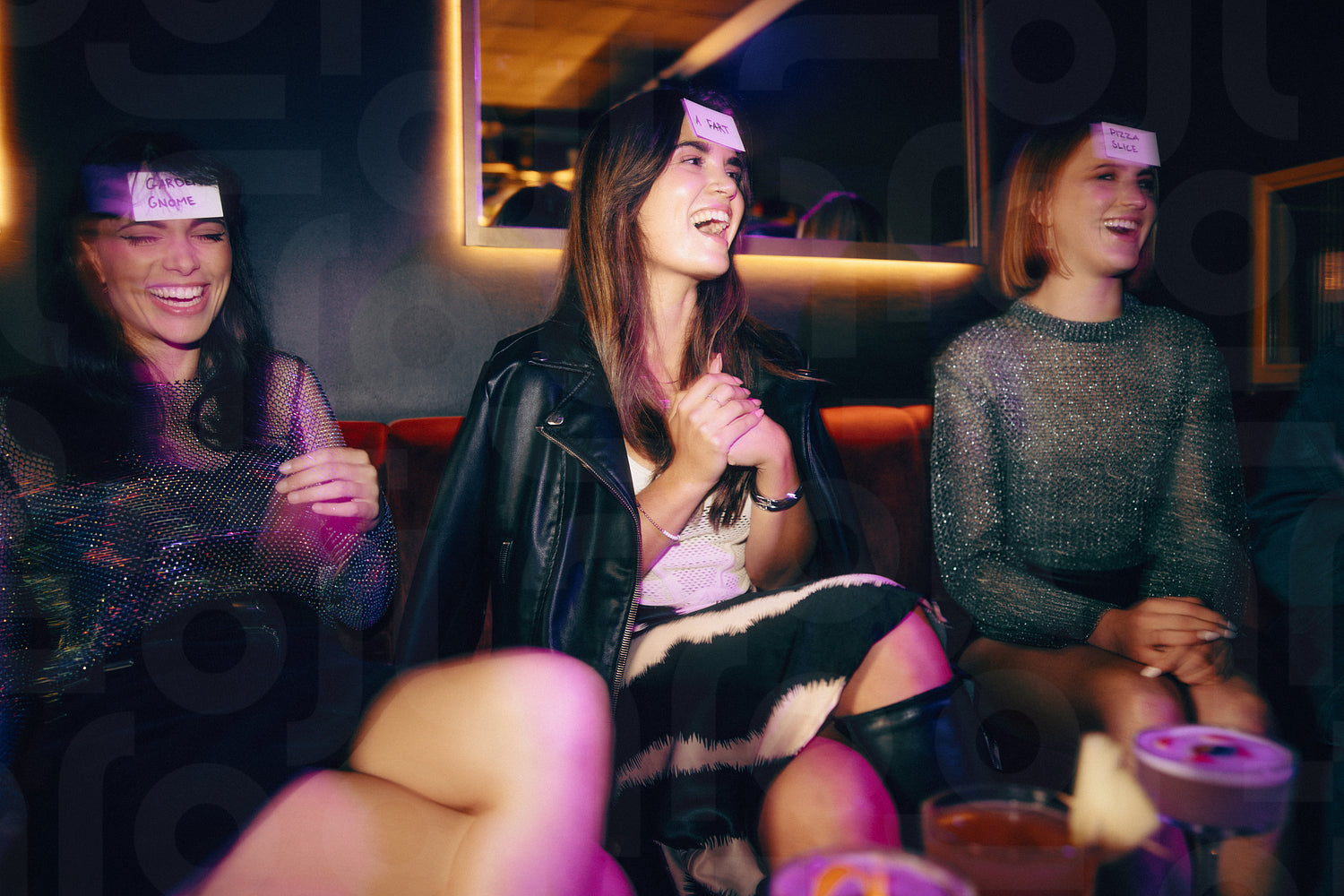 A group of friends shares laughter and fun playing games in a cozy environment. This photo has intentional use of 35mm film grain.