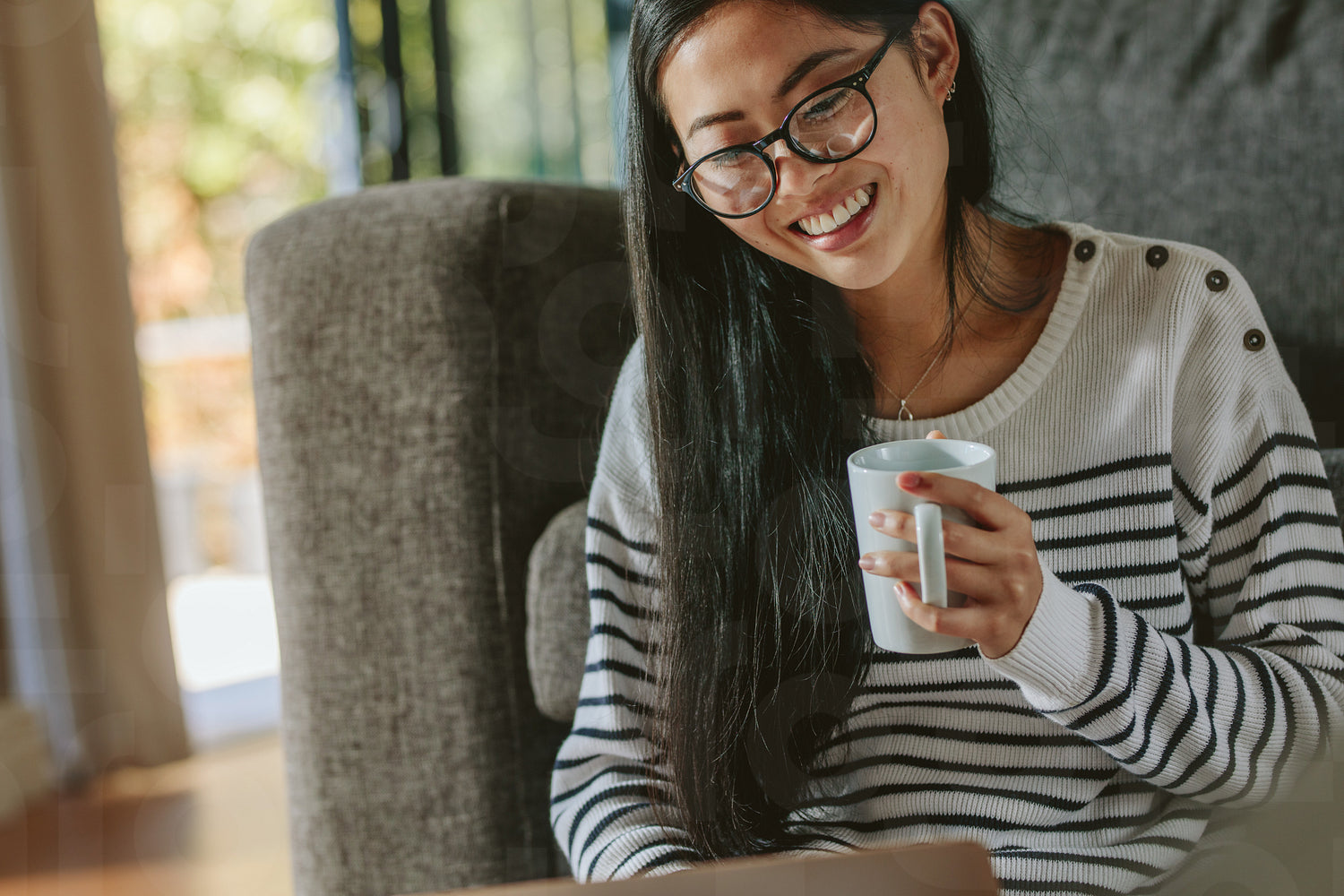 Smiling young woman with coffee in hand using laptop. Asian woman relaxing at home using laptop.