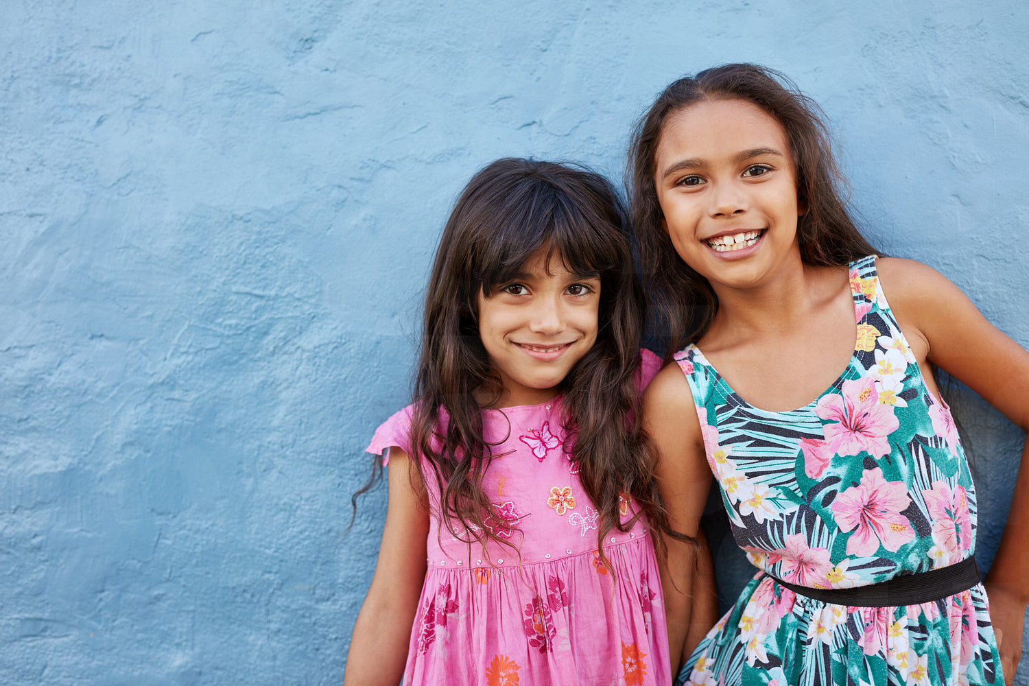 Portrait of two little girls standing together against blue background. Adorable little friends posing together with cute smile.