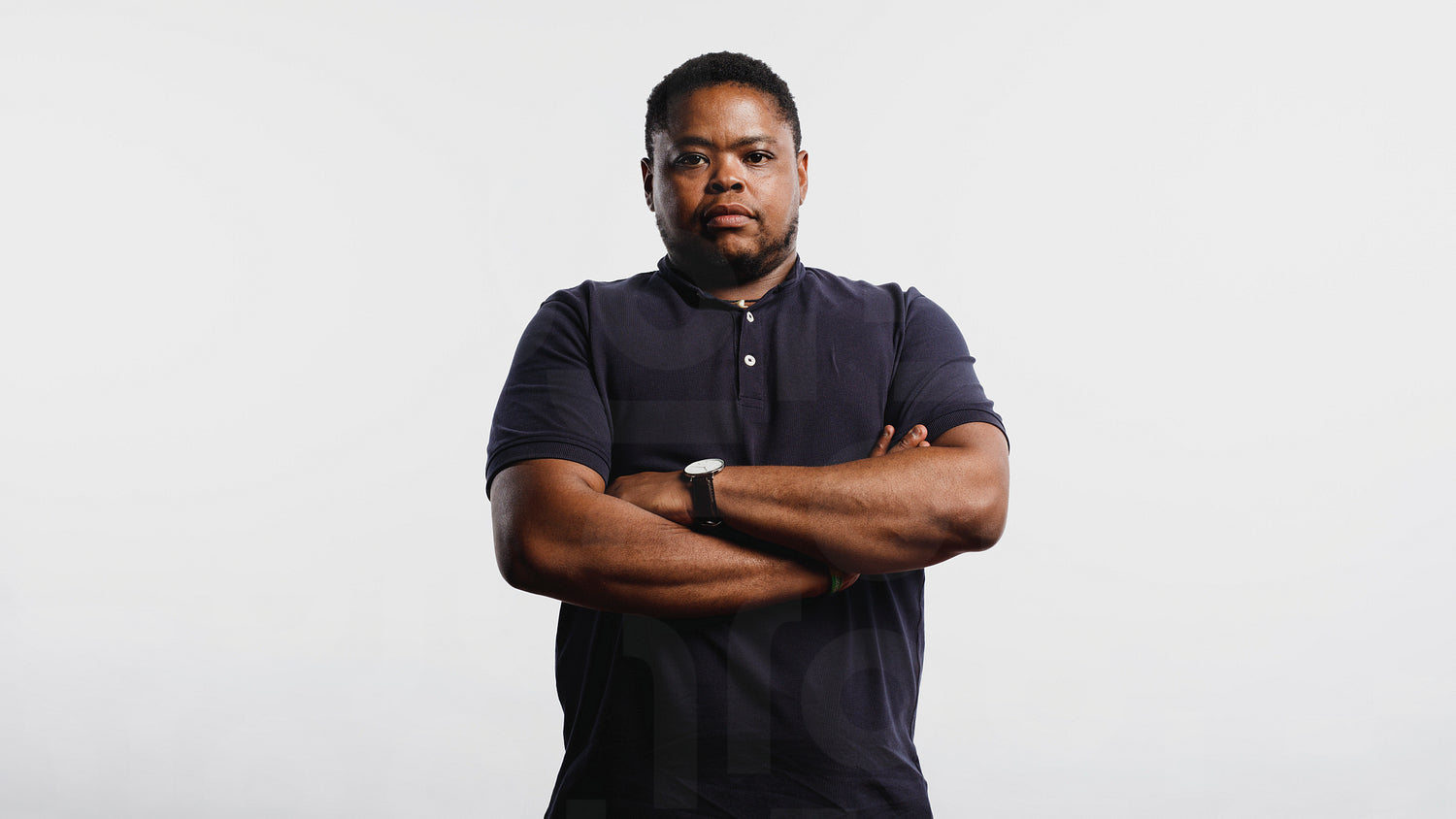 Portrait of a strong man standing with arms crossed. African man standing against white background looking at camera.